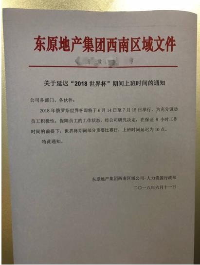 在球迷们翘首以盼的同时,一家地产公司发布的员工“看球福利”文件在社交媒体圈走红。11日,东原地产集团西南区域公司发布了《关于延迟“2018世界杯”期间上班时间的通知》,文件中明确表明,在6月14日-7月15日期间,为充分调动员工积极性,保障员工的工作状态,在保证8小时工作时间的前提下,世界杯期间部分重要比赛日,上班时间延迟到10点。