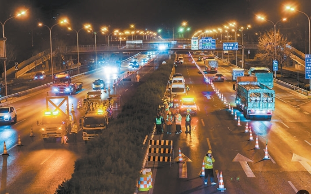 为最大程度减少施工对社会交通的影响,夜间临时封闭东四环主路半幅道路进行施工,白天施划临时标线恢复交通。施工期间预计只有半幅路面供车辆通行,交管部门将在远端设置好提示、绕行等标志,加派人员引导车辆。(张蕾)