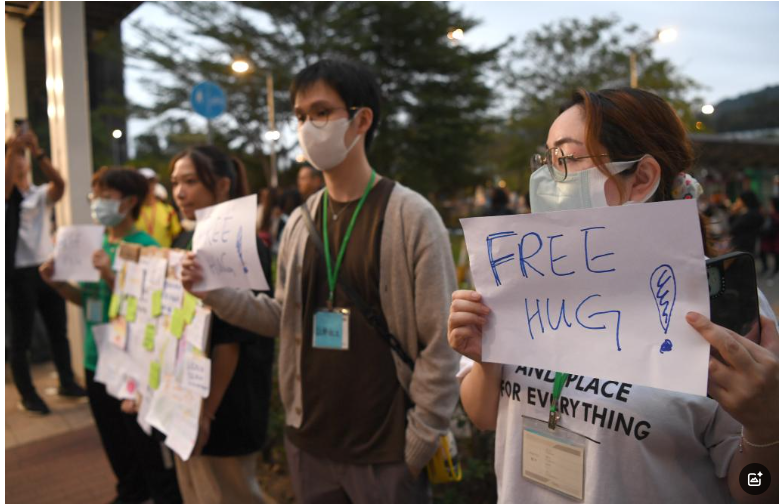 11月30日,义工在香港大埔广福休憩处举牌提供免费拥抱,提供心理疏导。新华社记者 陈铎 摄