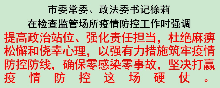 2月23日,市委常委、市委政法委书记徐莉在检查监管场所疫情防控工作时强调,提高政治站位、强化责任担当,杜绝麻痹松懈和侥幸心理,以强有力措施筑牢疫情防控防线,确保零感染零事故,坚决打赢疫情防控这场硬仗。