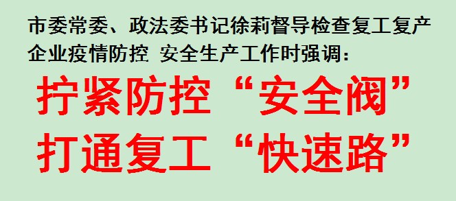 为全面落实省委、省政府安排部署,把全市工作重点从以疫情防控为主,转变到统筹兼顾疫情防控和经济社会发展上来,近日,市委常委、政法委书记徐莉深入到包保重点复工企业,实地调研并督导复工复产企业疫情防控、安全生产等工作。
