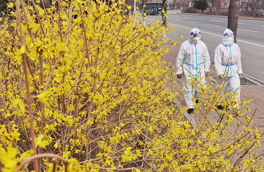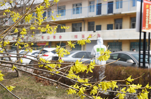 一辆医疗车从连翘花丛边快速驶过
