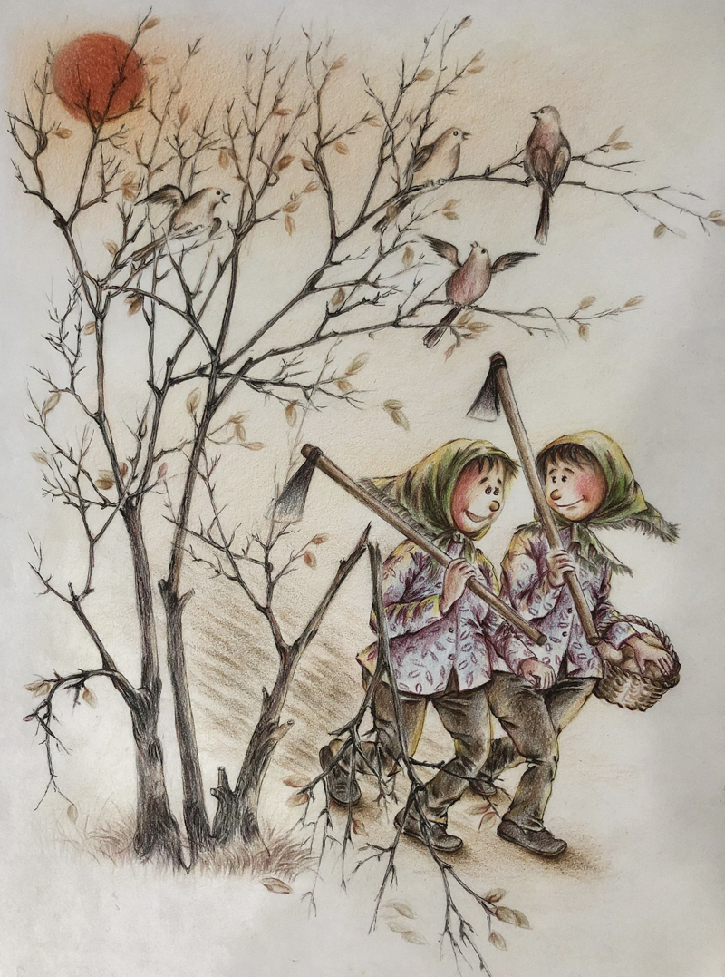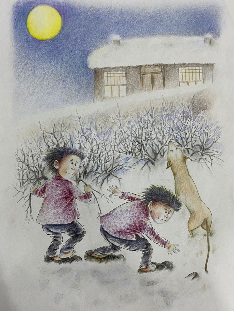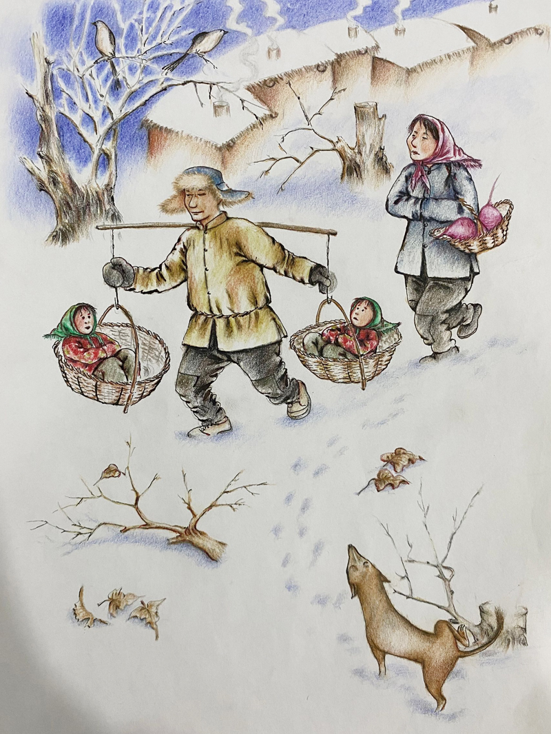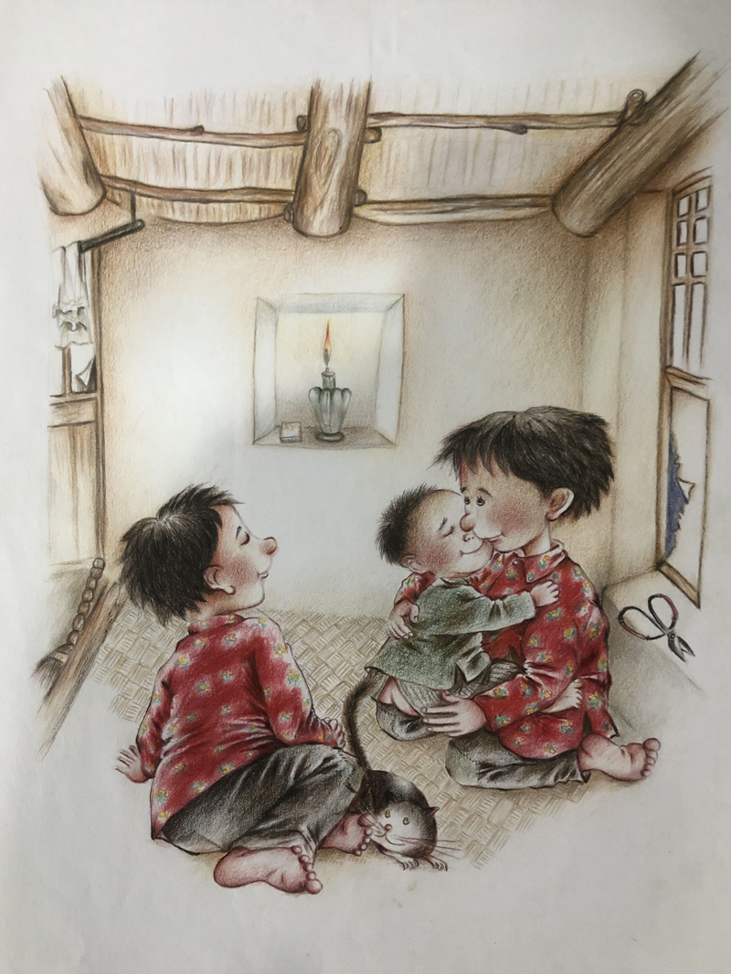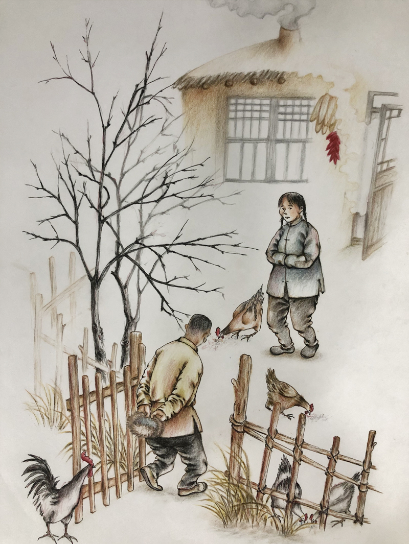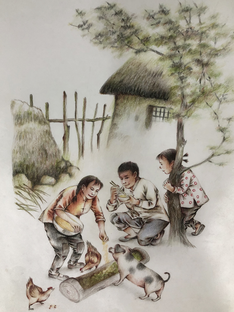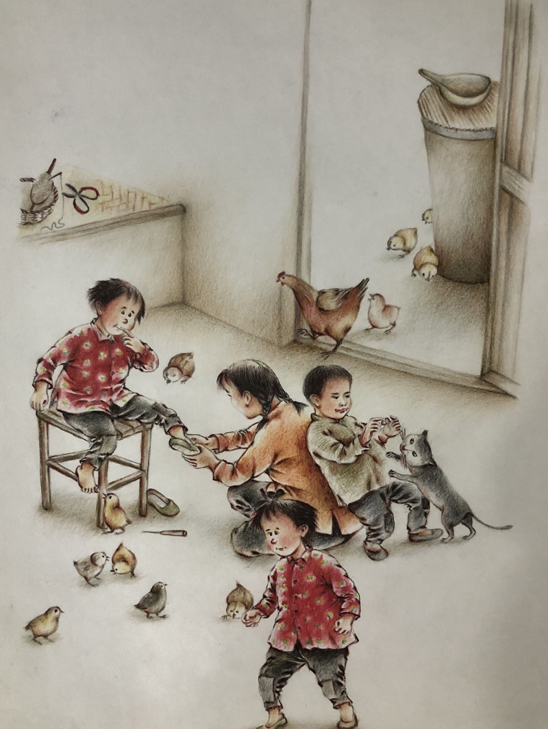 我俩没读过几年书,就辍学种地了。书不念了,可是笔从来没离开过手。山上开花的向日葵,结穗的苞米杆儿子;山坡上的小路、行人;屯子上空一缕缕升腾的炊烟;院子里用嘴啄着羽毛的鸡鸭,迈着四方步的大鹅;窗户下的大酱缸;挂在屋檐下一嘟噜一串的红辣椒;阳光底下,父亲给懒洋洋的、四脚朝天的小猪挠痒痒;母亲在冬天满屋子的蒸气里像仙女一样飘来飘去……都成为画的和写的内容。从来没有学过画的我们,就这样不停地写呀,画呀……一个偶然的机会,我俩得到了一本《伤逝》的画本,就被深深地吸引住了,一遍又一遍地临摹,从而产生了有一天自己也能画出一本书的想法。