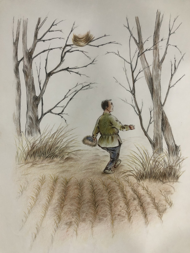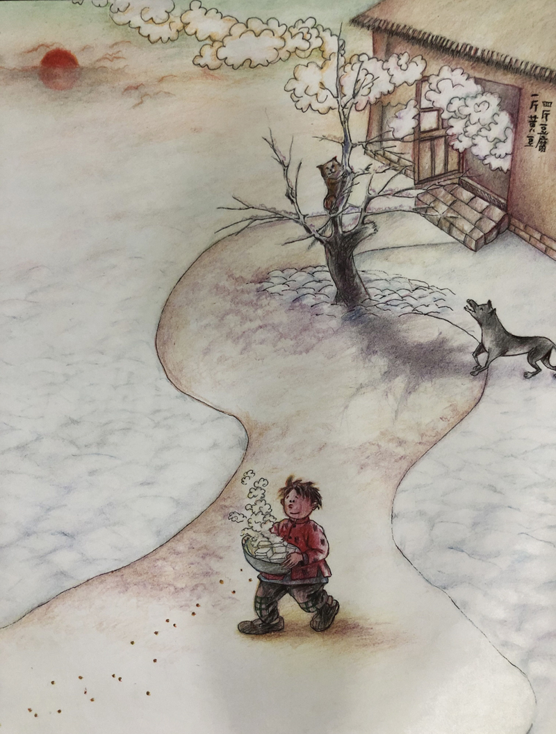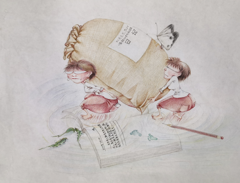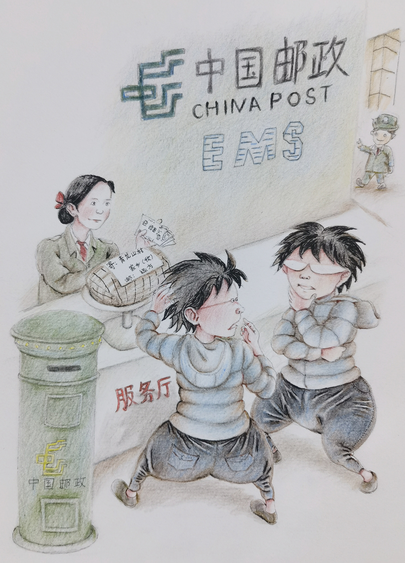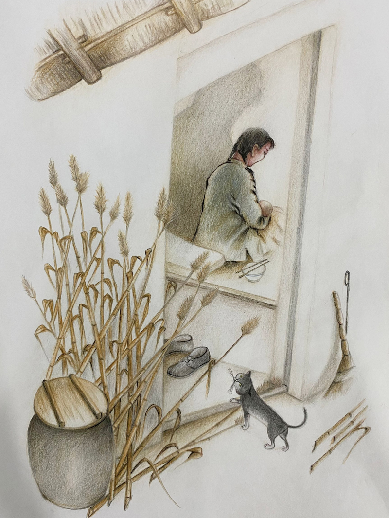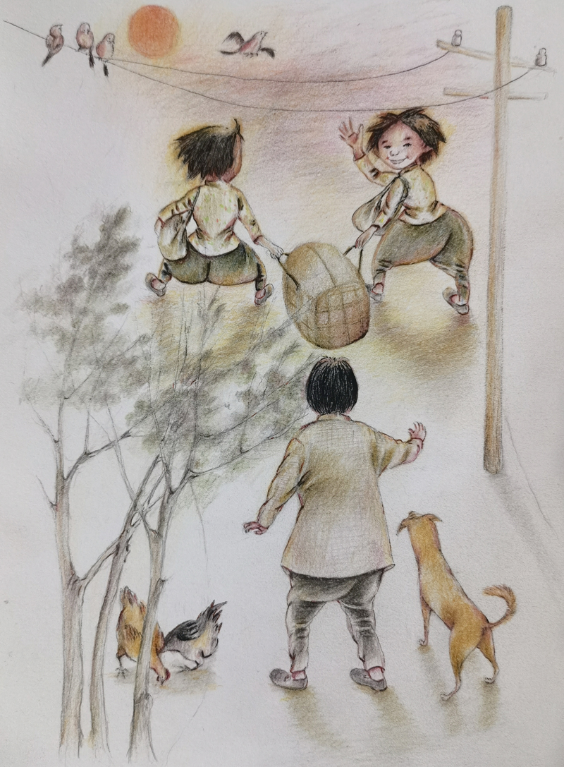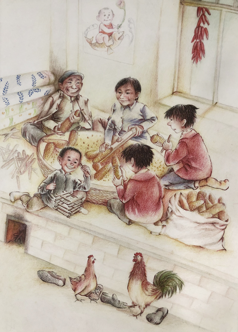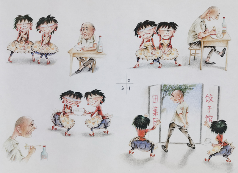 我俩没读过几年书,就辍学种地了。书不念了,可是笔从来没离开过手。山上开花的向日葵,结穗的苞米杆儿子;山坡上的小路、行人;屯子上空一缕缕升腾的炊烟;院子里用嘴啄着羽毛的鸡鸭,迈着四方步的大鹅;窗户下的大酱缸;挂在屋檐下一嘟噜一串的红辣椒;阳光底下,父亲给懒洋洋的、四脚朝天的小猪挠痒痒;母亲在冬天满屋子的蒸气里像仙女一样飘来飘去……都成为画的和写的内容。从来没有学过画的我们,就这样不停地写呀,画呀……一个偶然的机会,我俩得到了一本《伤逝》的画本,就被深深地吸引住了,一遍又一遍地临摹,从而产生了有一天自己也能画出一本书的想法。