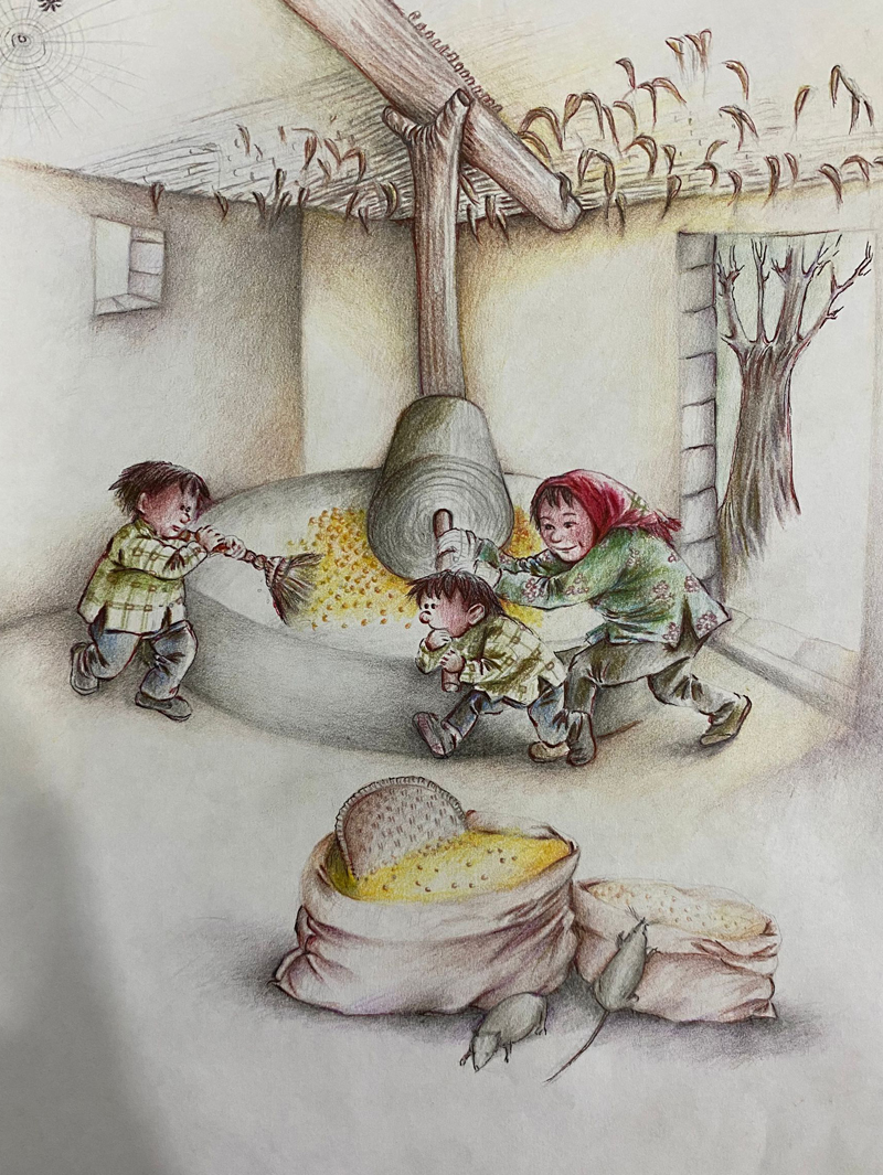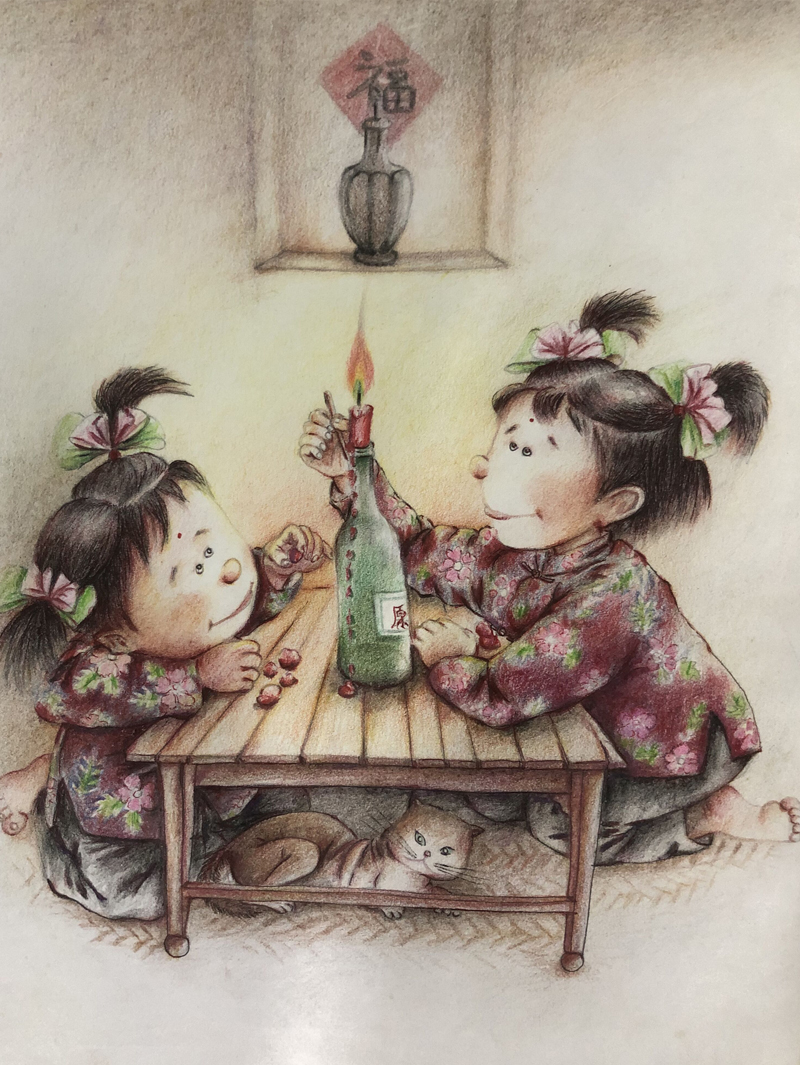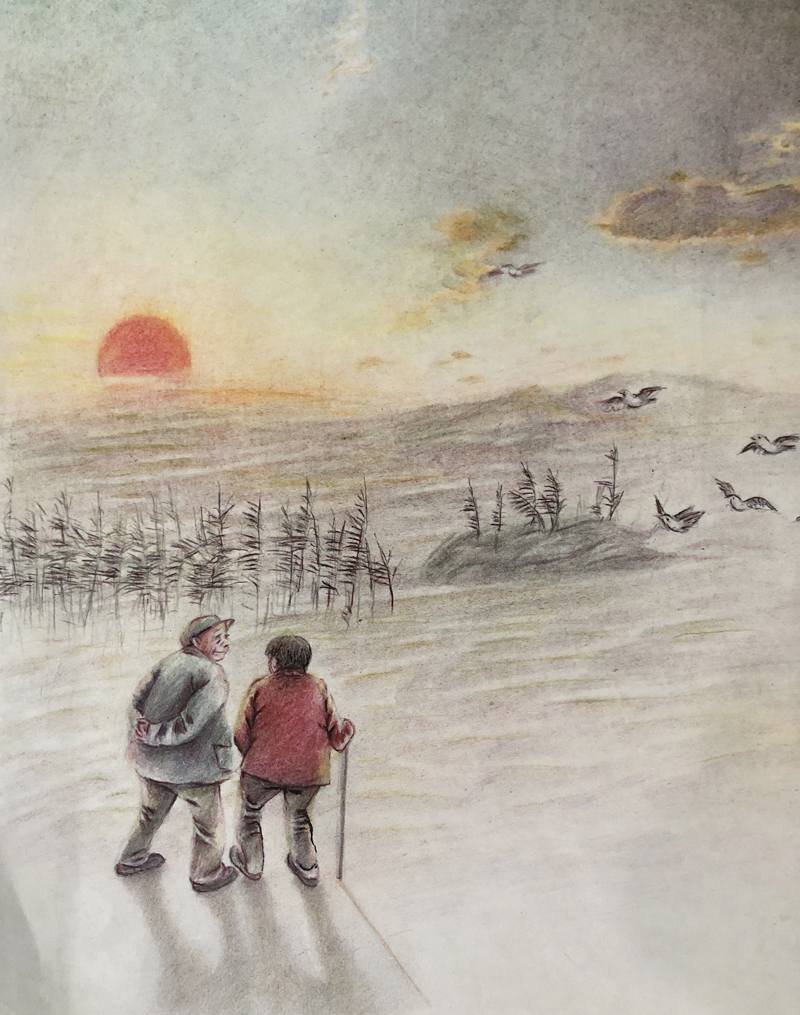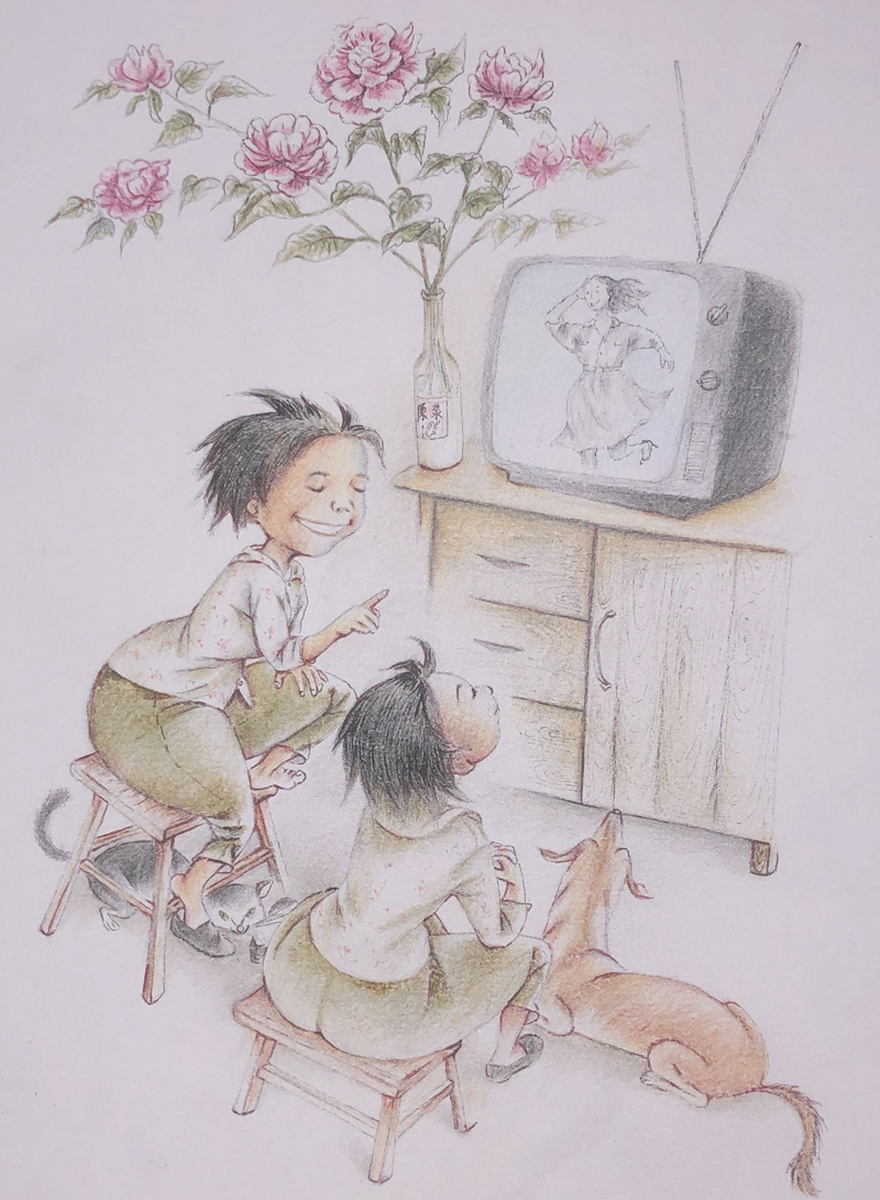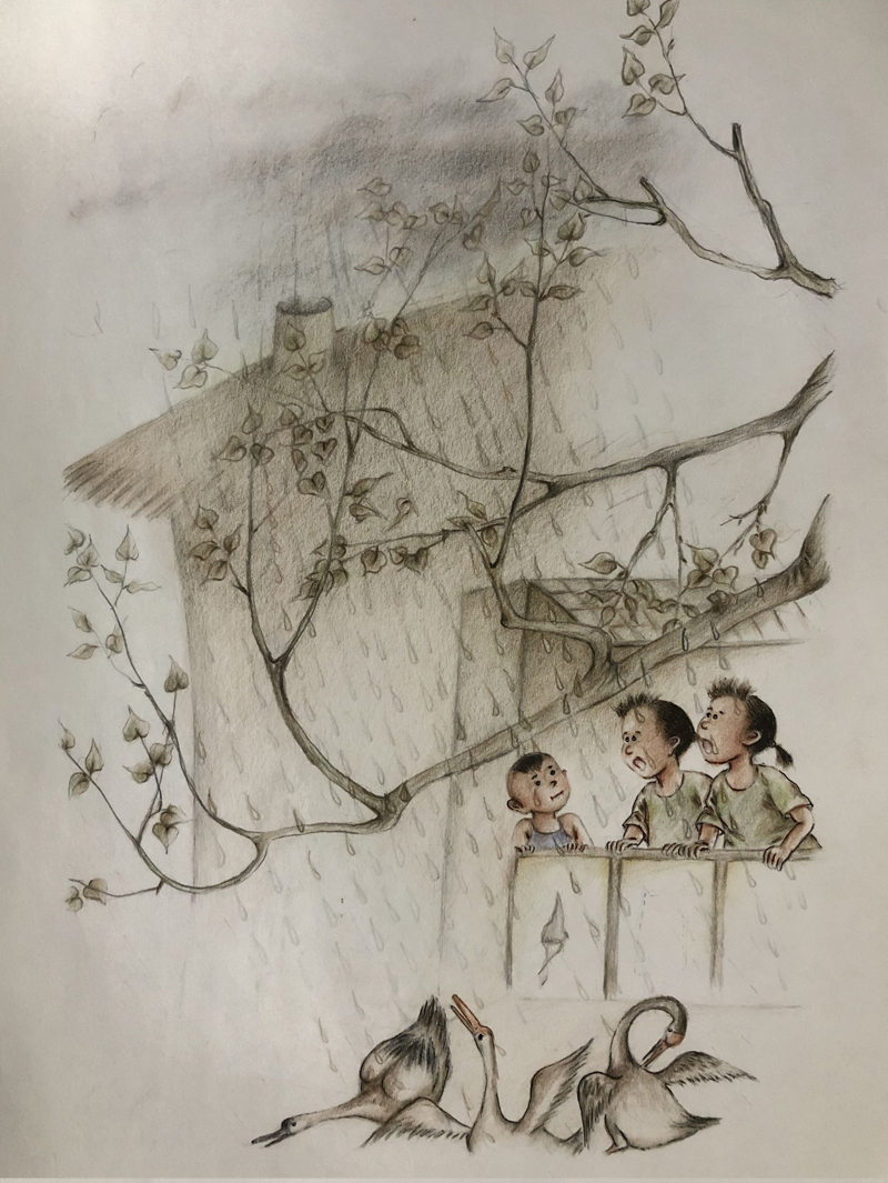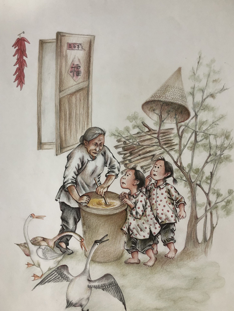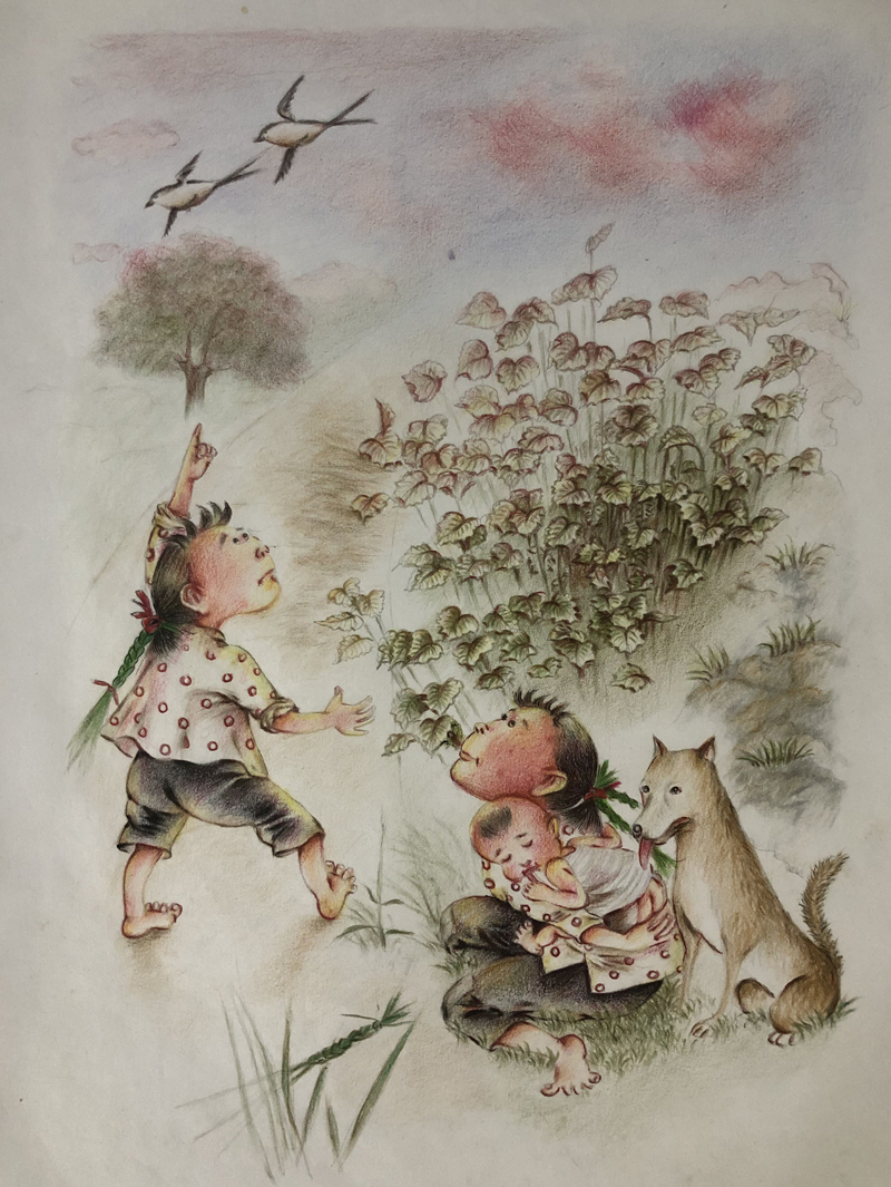 我俩没读过几年书,就辍学种地了。书不念了,可是笔从来没离开过手。山上开花的向日葵,结穗的苞米杆儿子;山坡上的小路、行人;屯子上空一缕缕升腾的炊烟;院子里用嘴啄着羽毛的鸡鸭,迈着四方步的大鹅;窗户下的大酱缸;挂在屋檐下一嘟噜一串的红辣椒;阳光底下,父亲给懒洋洋的、四脚朝天的小猪挠痒痒;母亲在冬天满屋子的蒸气里像仙女一样飘来飘去……都成为画的和写的内容。从来没有学过画的我们,就这样不停地写呀,画呀……一个偶然的机会,我俩得到了一本《伤逝》的画本,就被深深地吸引住了,一遍又一遍地临摹,从而产生了有一天自己也能画出一本书的想法。