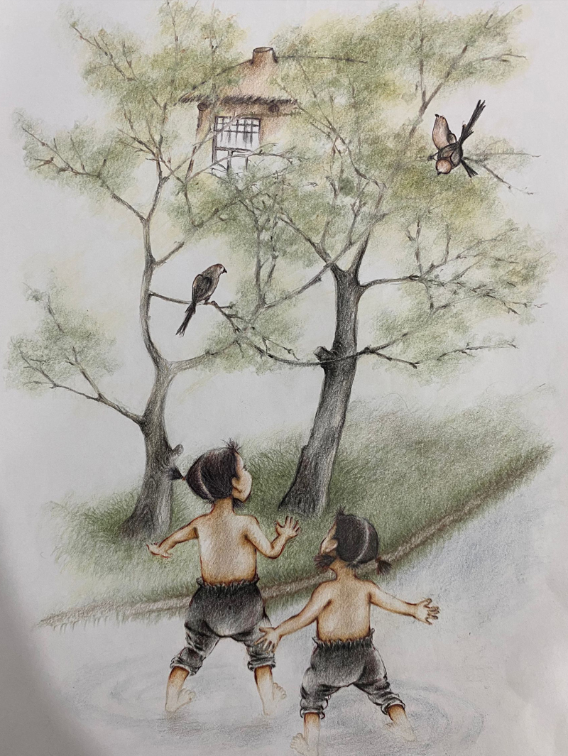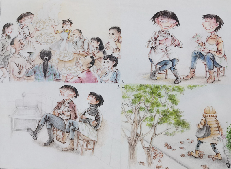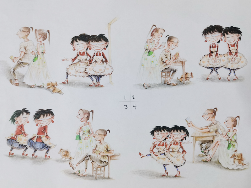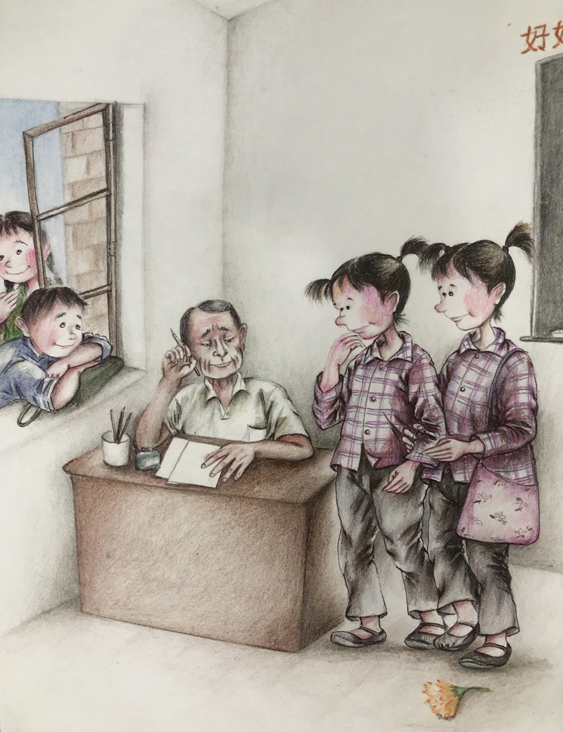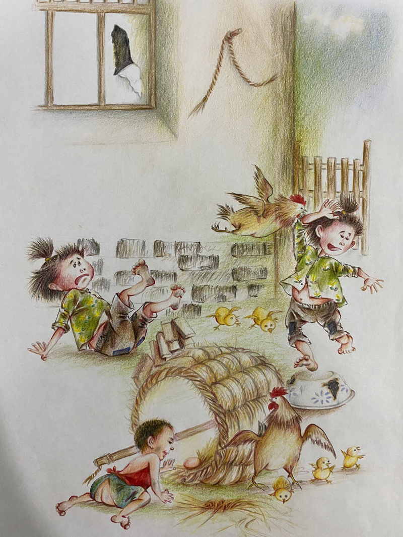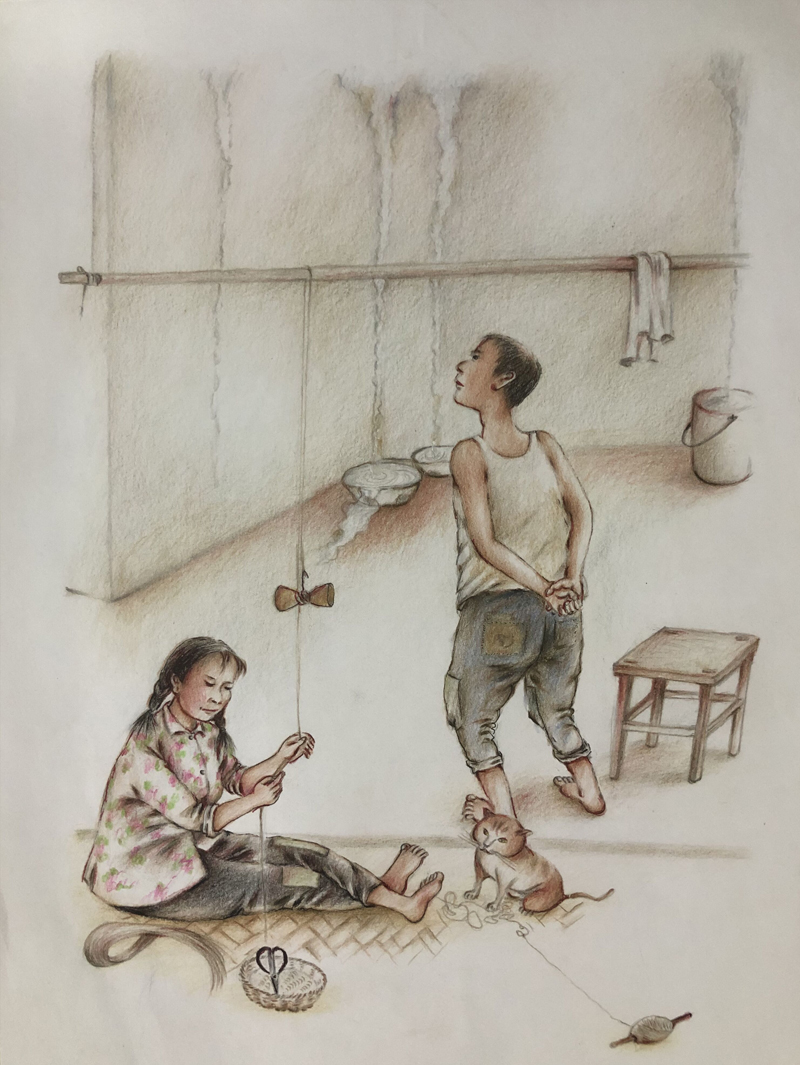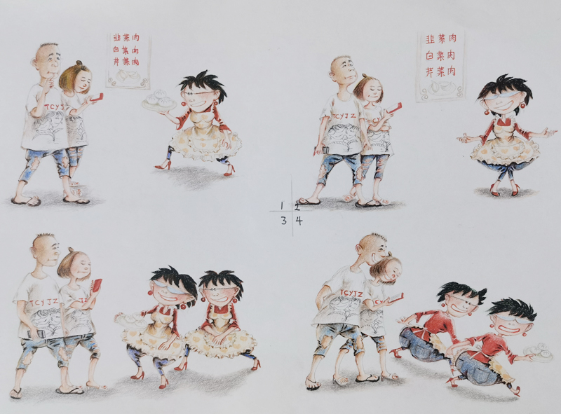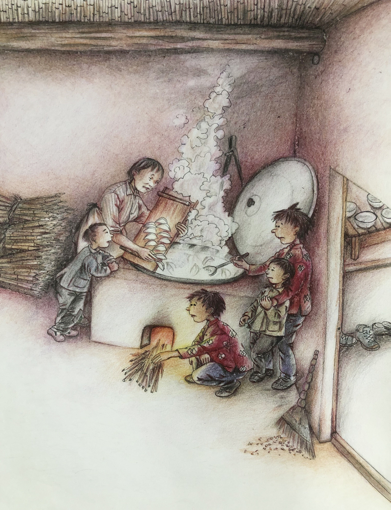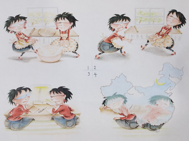 我俩没读过几年书,就辍学种地了。书不念了,可是笔从来没离开过手。山上开花的向日葵,结穗的苞米杆儿子;山坡上的小路、行人;屯子上空一缕缕升腾的炊烟;院子里用嘴啄着羽毛的鸡鸭,迈着四方步的大鹅;窗户下的大酱缸;挂在屋檐下一嘟噜一串的红辣椒;阳光底下,父亲给懒洋洋的、四脚朝天的小猪挠痒痒;母亲在冬天满屋子的蒸气里像仙女一样飘来飘去……都成为画的和写的内容。从来没有学过画的我们,就这样不停地写呀,画呀……一个偶然的机会,我俩得到了一本《伤逝》的画本,就被深深地吸引住了,一遍又一遍地临摹,从而产生了有一天自己也能画出一本书的想法。
