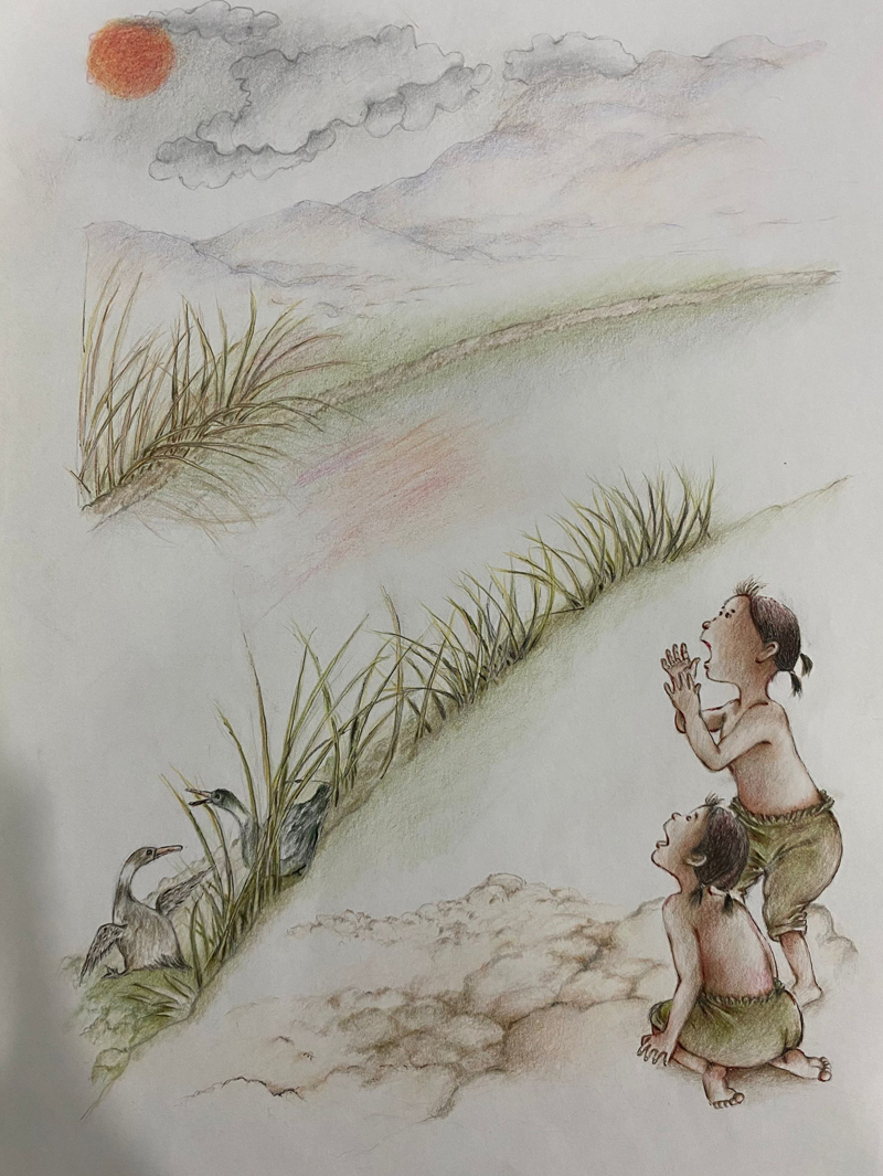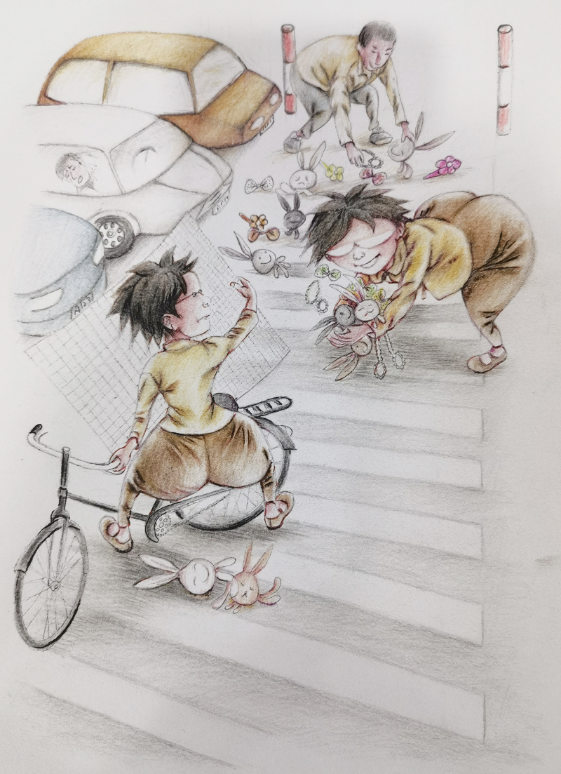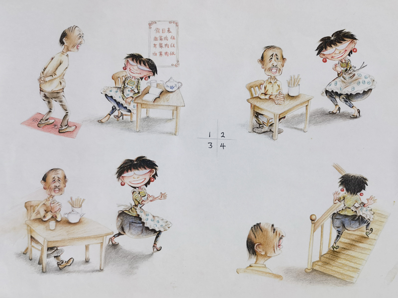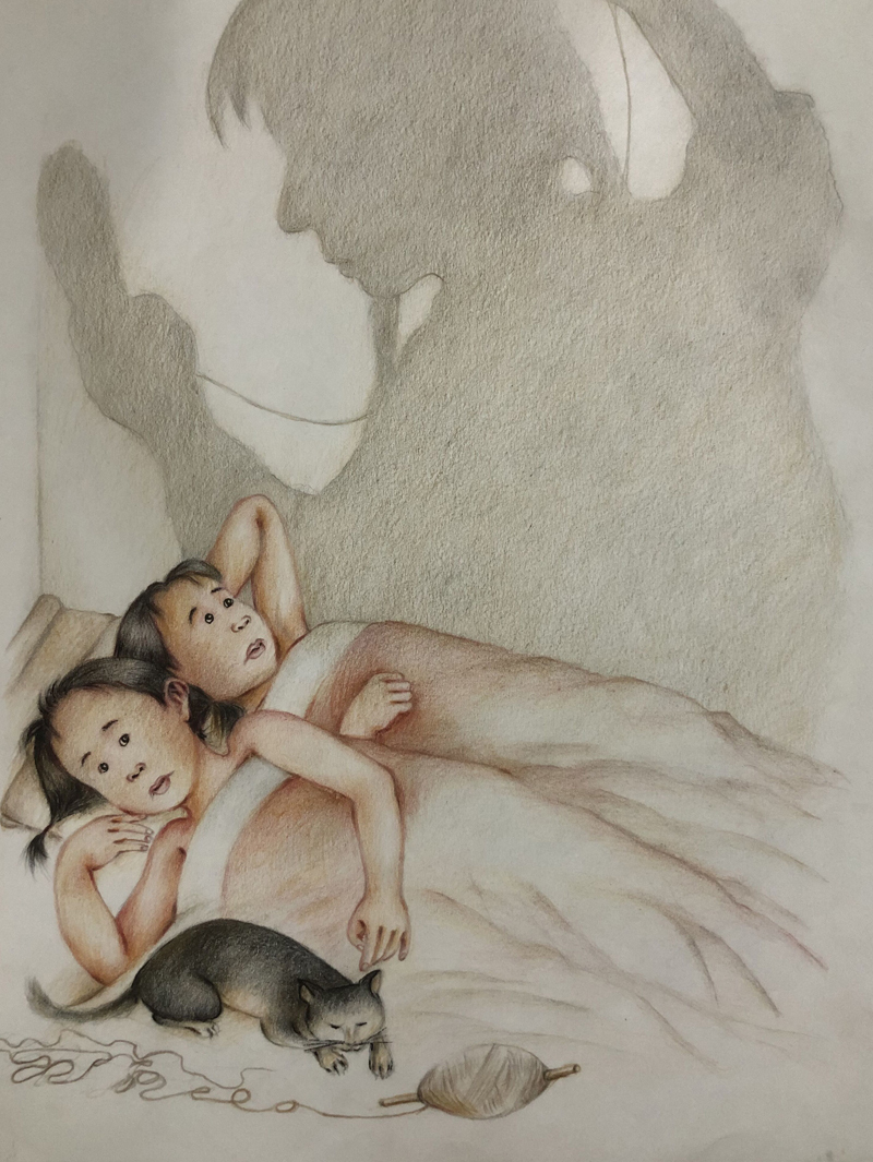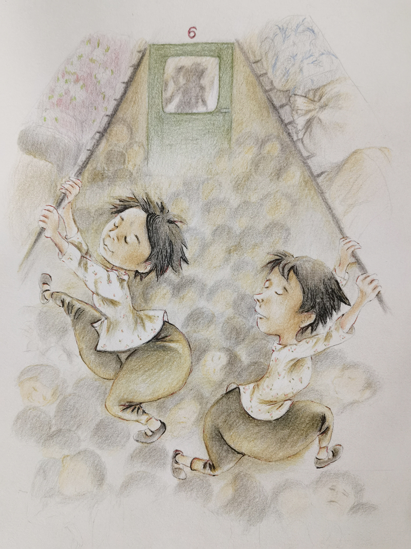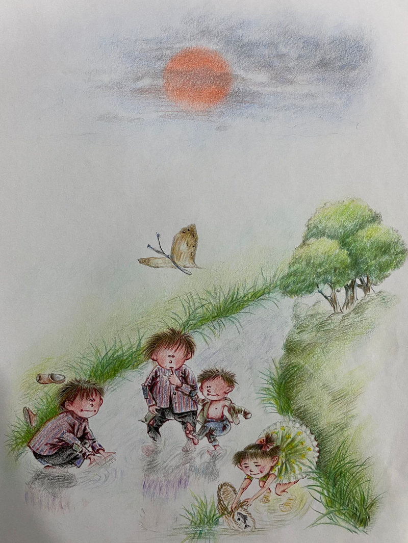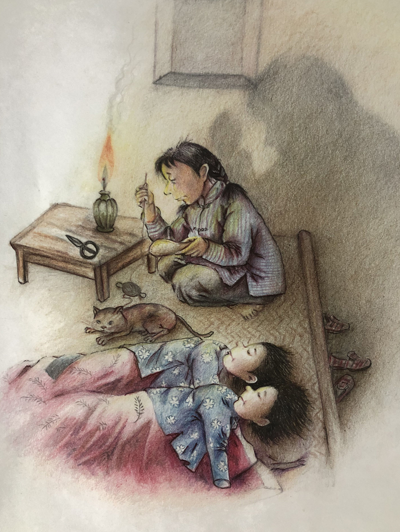 我俩没读过几年书,就辍学种地了。书不念了,可是笔从来没离开过手。山上开花的向日葵,结穗的苞米杆儿子;山坡上的小路、行人;屯子上空一缕缕升腾的炊烟;院子里用嘴啄着羽毛的鸡鸭,迈着四方步的大鹅;窗户下的大酱缸;挂在屋檐下一嘟噜一串的红辣椒;阳光底下,父亲给懒洋洋的、四脚朝天的小猪挠痒痒;母亲在冬天满屋子的蒸气里像仙女一样飘来飘去……都成为画的和写的内容。从来没有学过画的我们,就这样不停地写呀,画呀……一个偶然的机会,我俩得到了一本《伤逝》的画本,就被深深地吸引住了,一遍又一遍地临摹,从而产生了有一天自己也能画出一本书的想法。