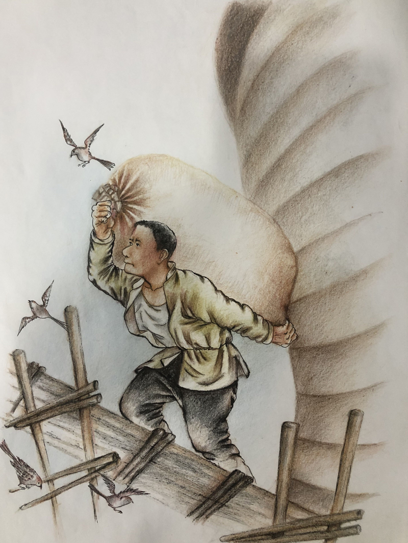 ▲ 农忙过后,别人都猫冬,父亲却要到粮库扛麻袋,补贴家用。父亲用一百二十斤的体重,扛起一百八十斤的麻袋,一天要扛几百包。父亲说,刚开始,一坐下休息就站不起来,可把他累拉拉胯了。每当这时,眼前就会出现孩子们哧溜哧溜喝苞米面糊糊的样子……咋能让孩子们连苞米面糊糊也断了流儿呢?想着,父亲就又来了劲儿。