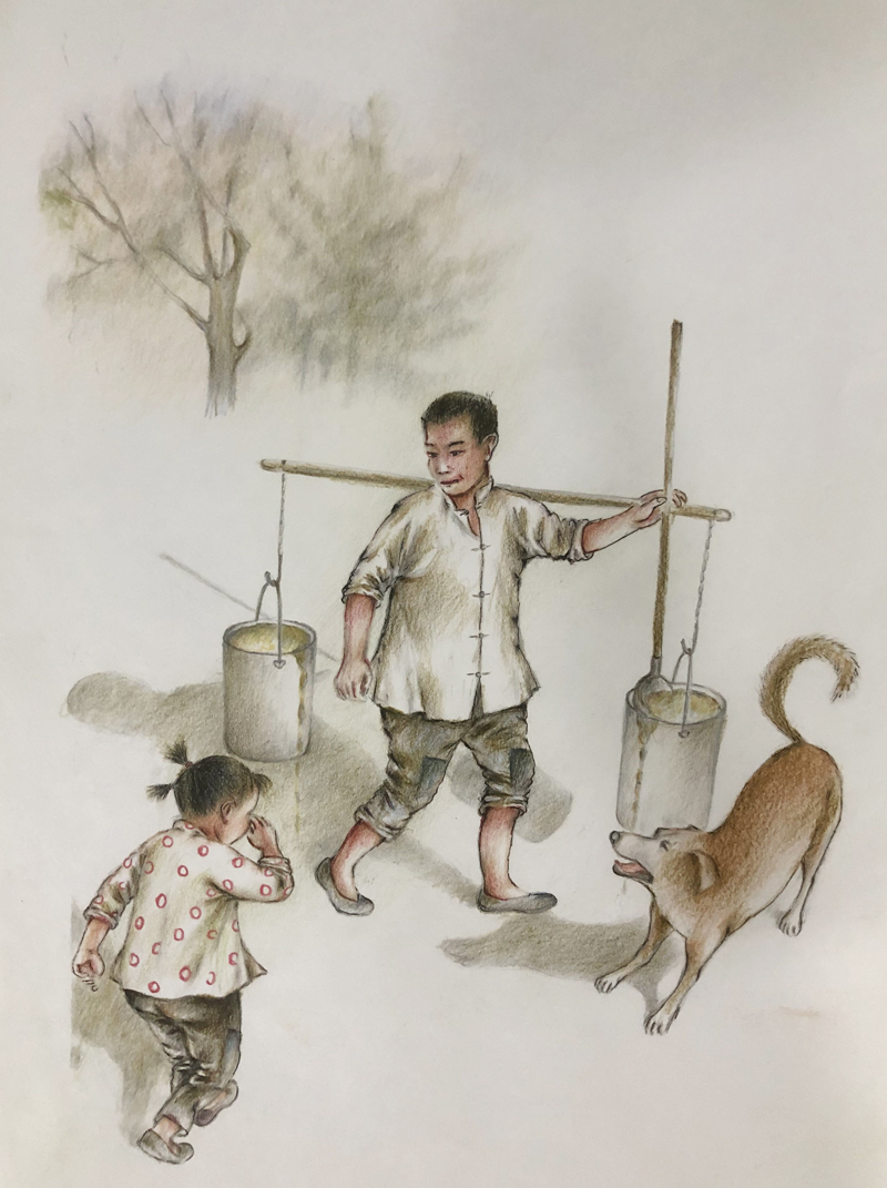 ▲ 在坡下,大双子看到父亲挑着满当的两筲大粪汤子一走一摆地过来,筲里粪便漓漓拉拉往外淌。大双子一步三跌地抢上前,顾不上扑面而来的恶臭,哭着告诉父亲:猪死了!父亲没有任何表情,只说知道了。父亲的平静,让大双子不安的心,踏实了许多。