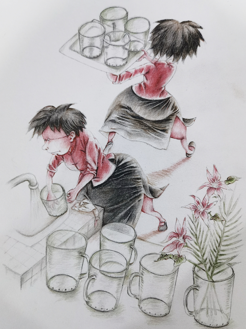 ▲ 后来,经过二十多天的培训,我俩成了自助餐厅的服务员。开业的前一天,经理在花名册上圈圈点点,把光鲜亮丽的高个子姑娘都叫出去,安排到餐厅面子上的岗位了。剩下我们两个小个儿子,经理派去后面洗杯洗碗。比起之前的工作,也算是有了提升。