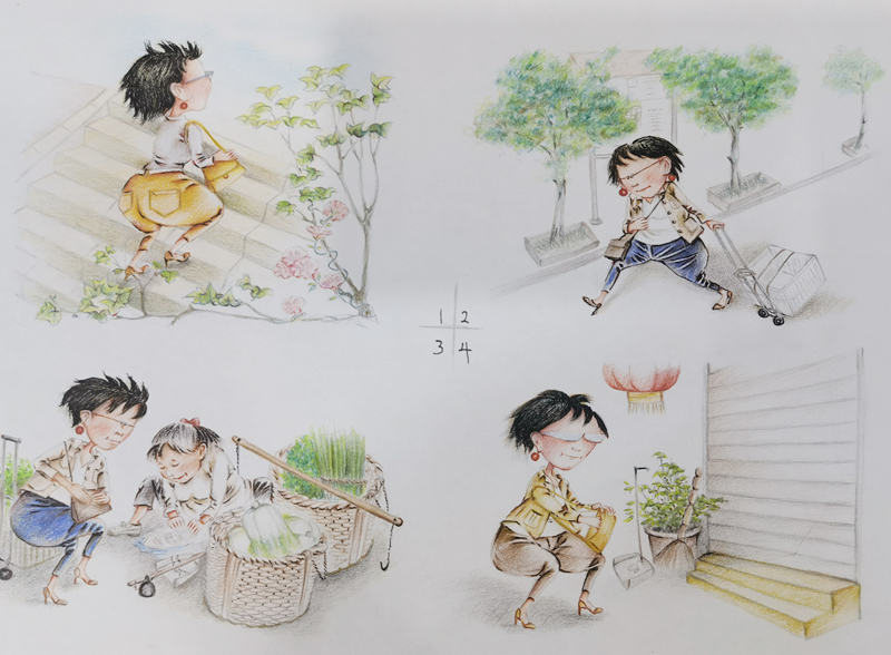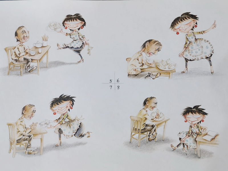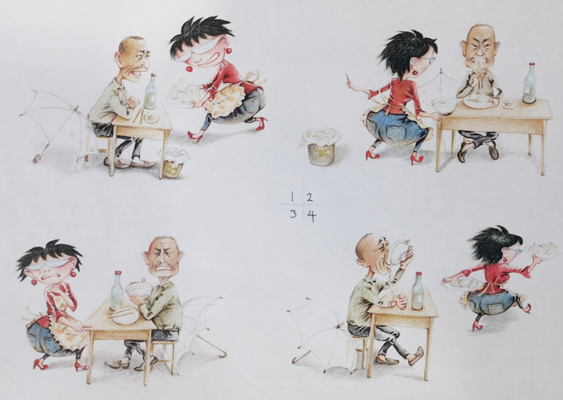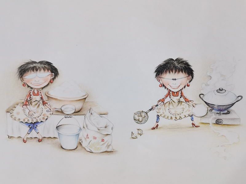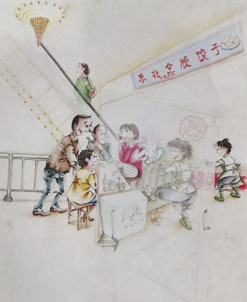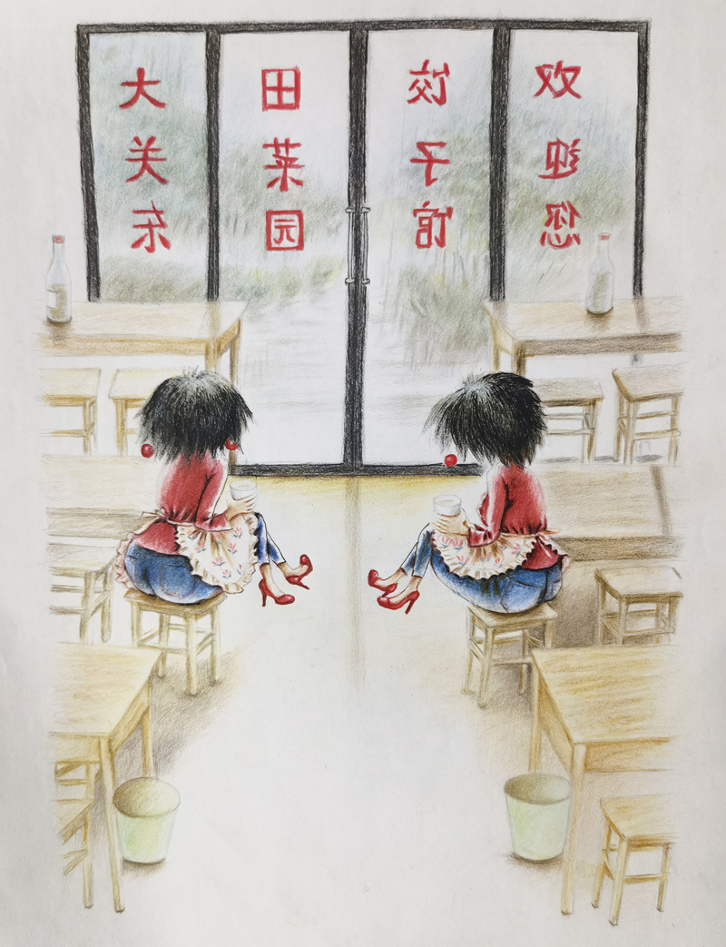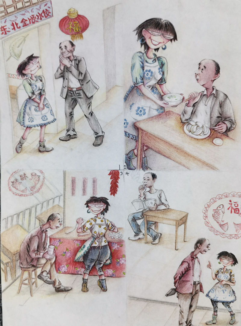 这段从漂泊到稳定的城市生活,我俩虽然没穿上想穿的裙子,但是把对裙子的喜欢,都穿在故事里的人物身上了;还有,把自己扎围裙当老板娘的样子,制作出像翻开的书一样的两幅大画贴在墙上,占据了半面墙。就是这两幅用爷当年的话说:“跟真人儿似的,鼓出来的画”,为我们的生意吸引了不少食客。在他们拍照留念和赞许下,更坚定了我俩继续写画下去的决心!白天,我俩在店子里干活;晚上回来不管几点,我俩都坚持画上几笔,写上几句,把店子里的故事用夸张一点的样子表现出来。