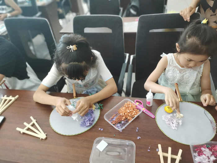 活动现场,每张桌子上都整齐地摆放着空白团扇、永生花、剪刀、胶水等手工制作材料和工具,工作人员向大家介绍团扇的起源与历史发展,细心讲解干花团扇的制作过程和注意事项。随后,孩子们拿起材料,充分发挥自己的创意和想象力,和家长一起造型设计,从整体构图到干花色彩搭配再到粘贴制作,时不时互相交流,现场气氛十分活跃。最后,大家把制作成果摆放在一起展示,原本空空的扇面瞬间花团锦簇。
