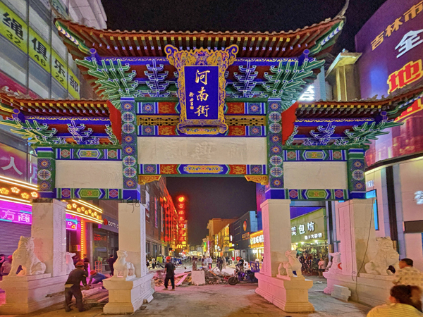 7月1日,位于船营区河南街与珲春街交汇处,由吉林市河南街百年老字号新兴园捐建的河南街牌楼竣工。该牌楼整体采用湖南长沙一级汉白玉修建,全手工雕刻。牌楼长10米,宽2米,高10.5米。河南街牌楼匾额“河南街”三个字由时任东三省总督、后为民国大总统的徐世昌题写;主柱楹联由“吉林三杰”之首成多禄题写。