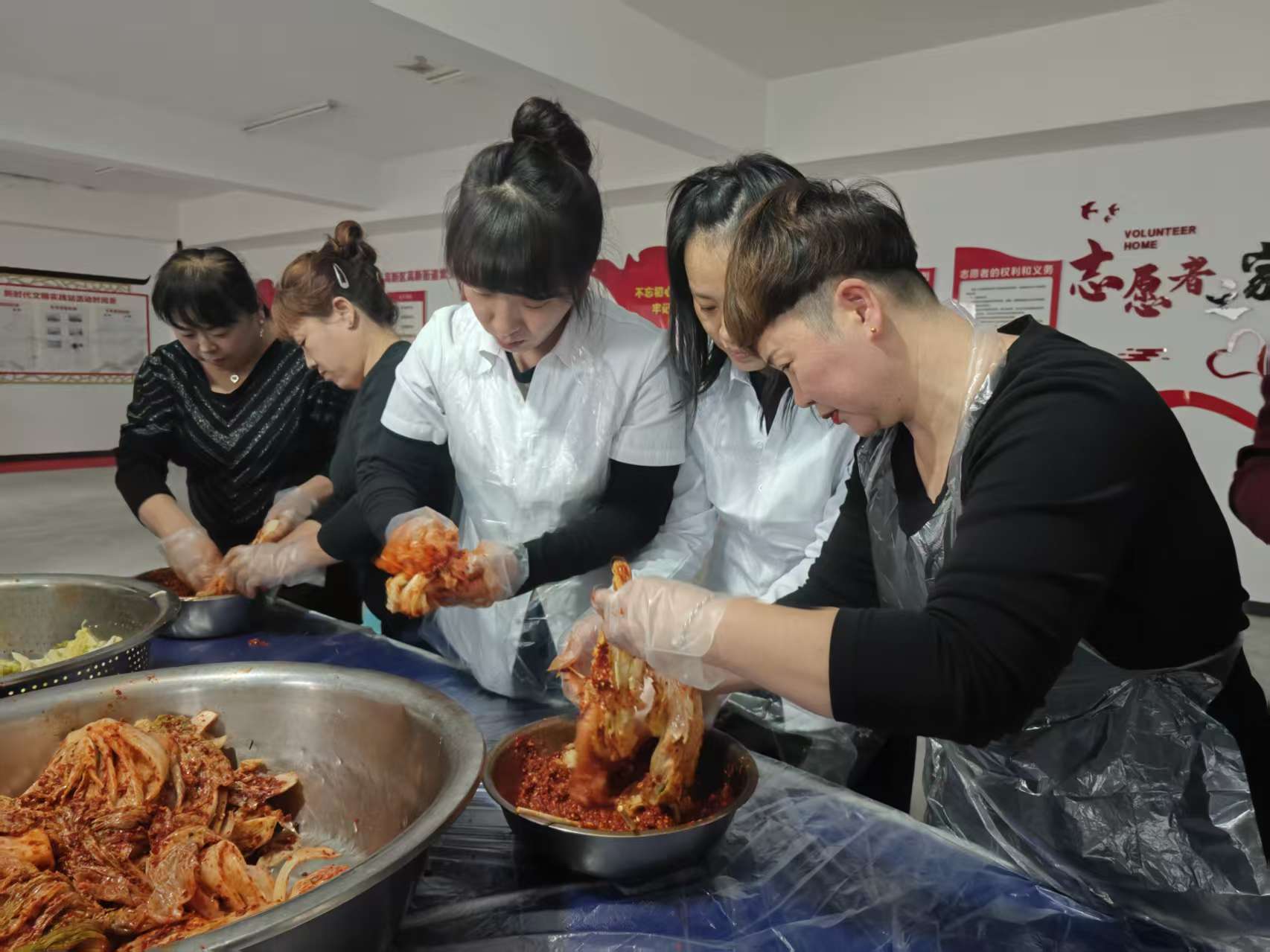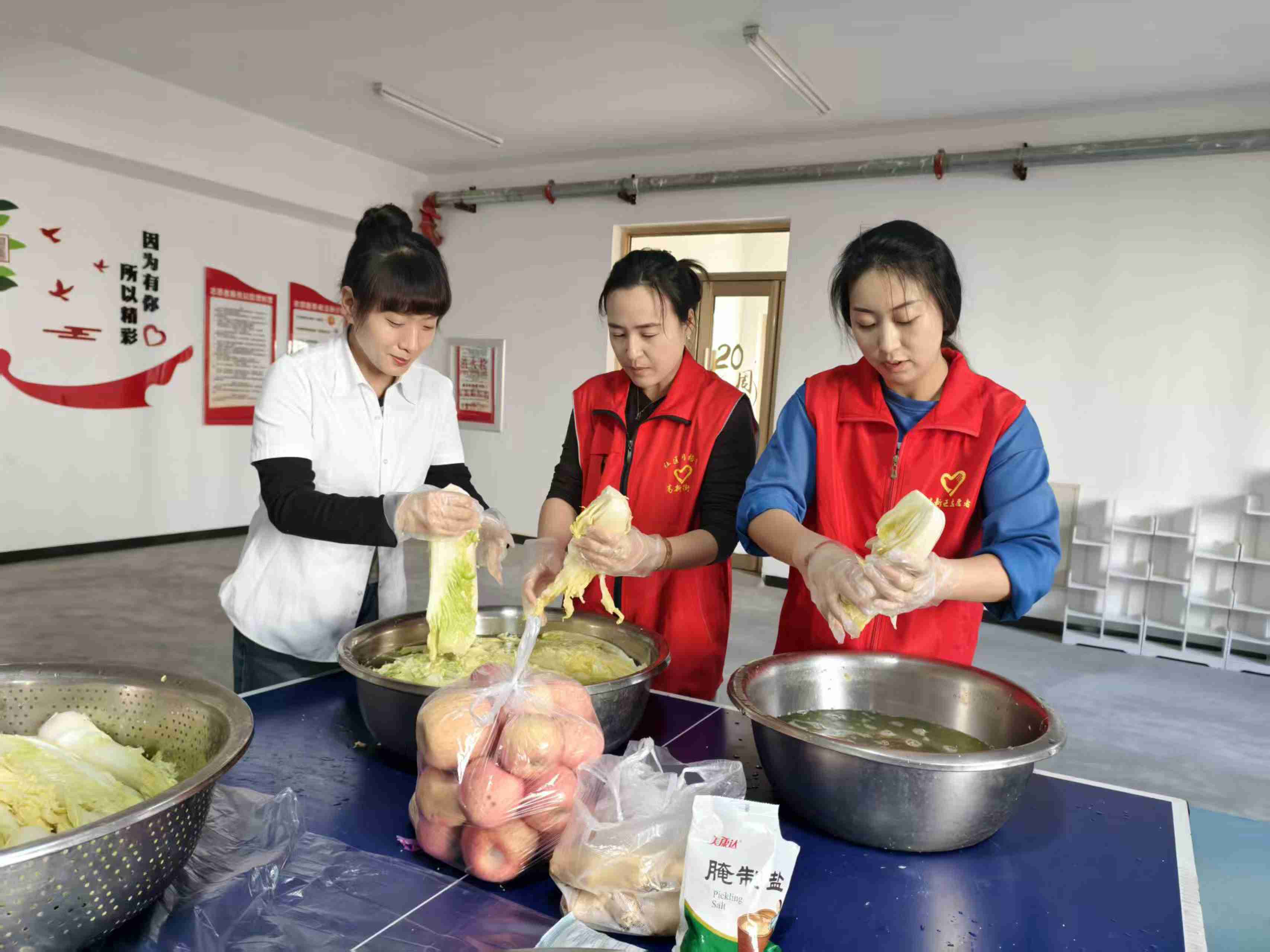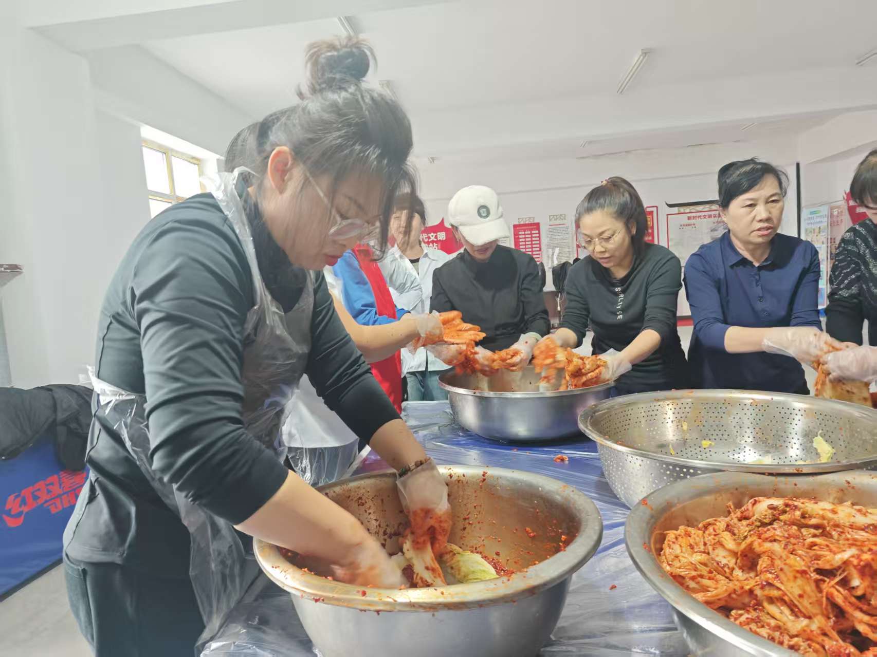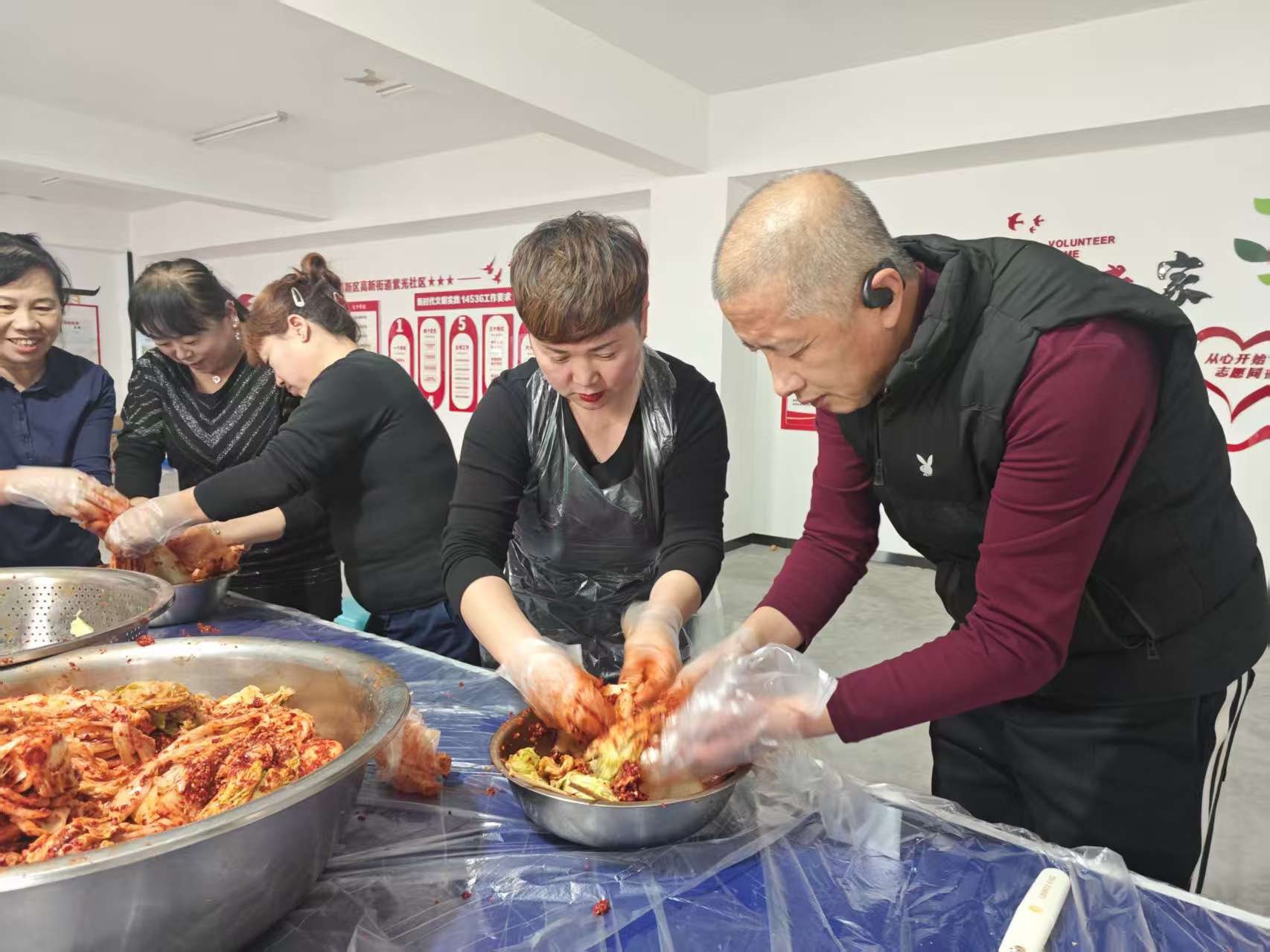 活动当天,社区活动室内热闹非凡,叔叔阿姨们带着笑容早早来到现场,迫不及待地加入腌菜队伍。随着一声 “开始腌制啦”,现场瞬间热闹起来。有的负责给腌好的白菜挤干水分,有的专注地调制辣椒酱料,有的小心翼翼地将酱料均匀涂抹在白菜叶上,还有的帮忙将腌好的辣白菜装入密封罐中。