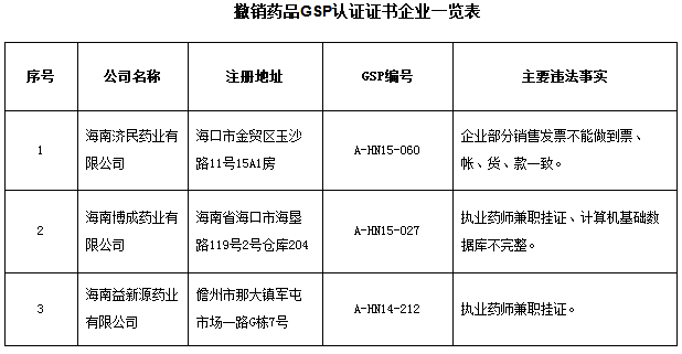 12月18日,海南省食药监局官网发布公告称,海南济民药业有限公司等3家药品批发企业严重违反《药品经营质量管理规范》的规定,依据《药品医疗器械飞行检查办法》(国家食品药品监督管理总局令第14号)第二十五条、《药品经营质量管理规范认证管理办法》(国食药监市〔2003〕25号)第四十五条和《药品经营质量管理规范现场检查指导原则》监督检查结果判定标准,该局决定依法撤销海南济民药业有限公司等3家药品批发企业药品GSP认证证书,现予以公布。有关违法违规行为已移交相关市县食品药品监督管理部门依法严厉查处。 (松花江网编辑 李明丹)
