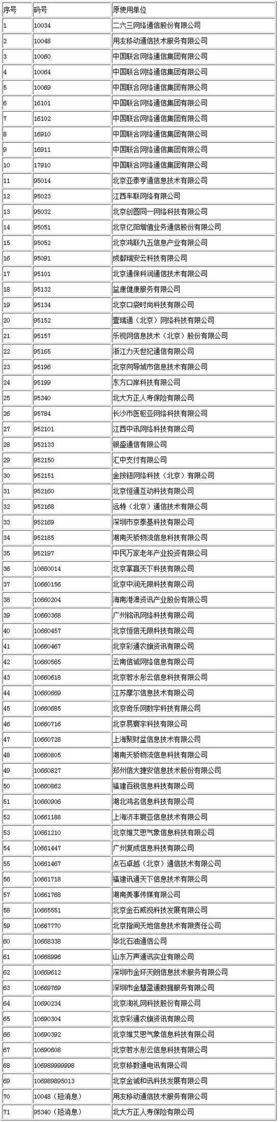 据工信部官网,工信部昨日发布关于拟收回部分电信网码号资源情况的公示。公示信息显示,此次拟收回码号共计71个,原使用单位涉及包括二六三网络通信股份有限公司(码号10034)、中国联合网络通信集团有限公司(码号10060、10064等8个)、乐视网信息技术(北京)股份有限公司(码号95157)、用友移动通信技术服务有限公司(码号10048)以及北大方正人寿保险有限公司(码号95340)等数十家不同企业。
