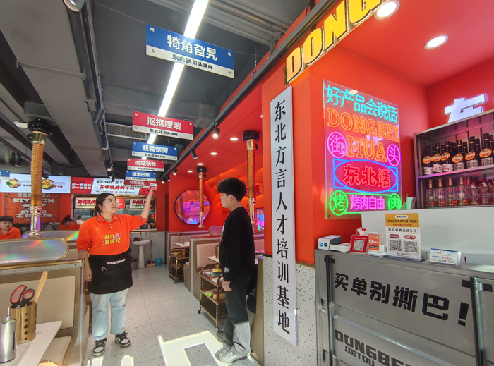 东北话街头烤肉店将店面布置成“东北话培训基地”,令前来就餐的食客耳目一新。