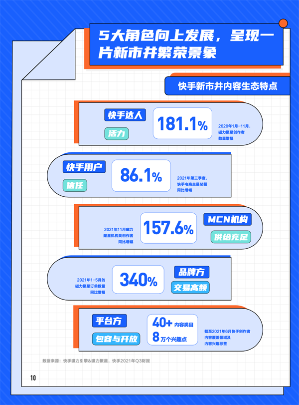 在新市井商业生态中,快手达人、用户、MCN机构、品牌方、平台方五大角色向上发展,同时,内容生态表现出的特征也与新市井商业生态的特点一脉相承,“活力”、“信任”、“供给充足”、“交易高频”、“包容与开放”五大特征鲜明突出,呈现出一片新市井繁荣景象。