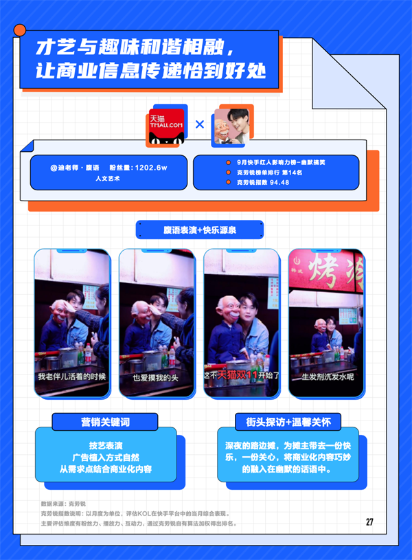 达人“整活”创造多元丰富内容,凭借强互动力和高热点汇聚人气,“关系铁”汇聚信任,以高复购率提升电商转化能力,社区“烟火气”则以兴趣关系汇聚情怀,从而打造强烈的圈层影响力。快手的特色达人,用十八般武艺和真实的生活,将自身价值传递给品牌,为品牌聚人气、聚情怀、聚信任。