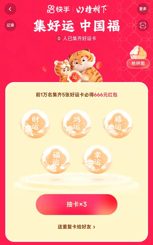 除闯关外,集卡这一快手经典新春项目也再次回归。今年,用户点击主会场页面右下角的“集好运”标识,可一键直达集卡活动页面;集齐五张好运卡,即可参与除夕分一亿;前一万名完成任务的用户必得666元早鸟红包;二轮集齐还有机会再瓜分一亿现金红包。