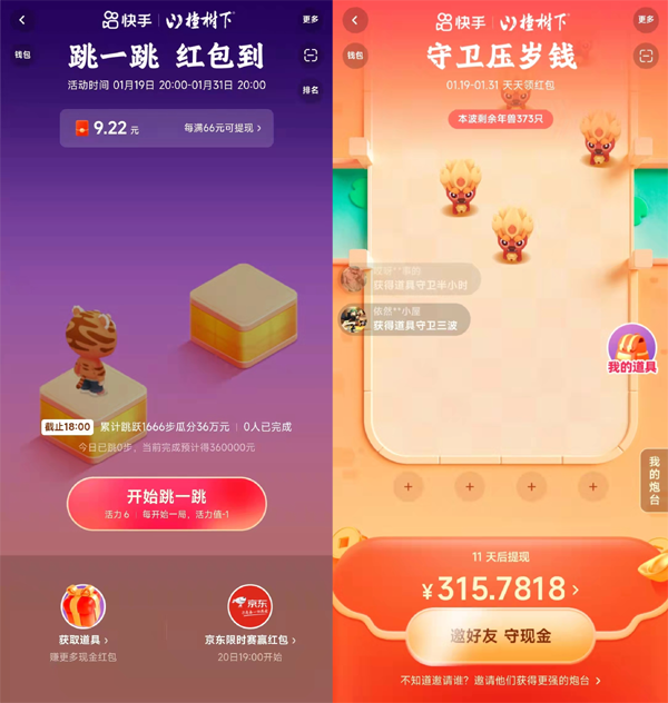 新的一年,不仅经典玩法有“新”意,快手还上线了“跳一跳 红包到”、“守卫压岁钱”等全新玩法,送出更多红包福利。