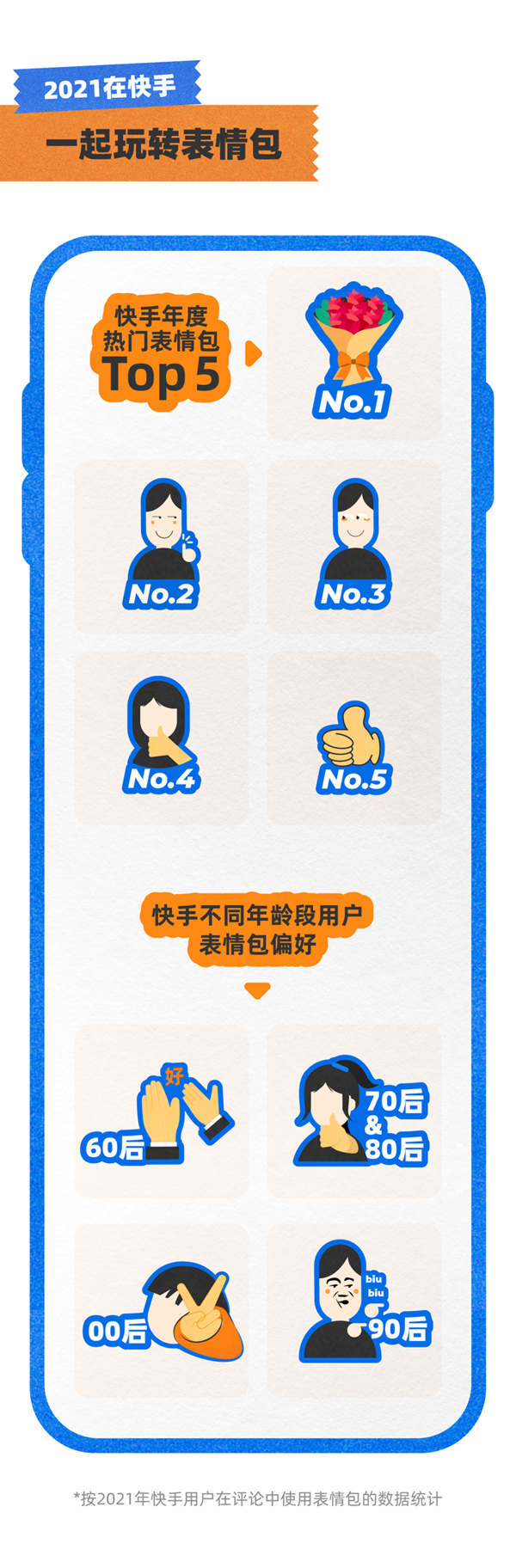 值得一提的是,快手2021年度热门表情包Top5中,3个都与“点赞”相关。或许,这就是所谓“温暖”之一种。