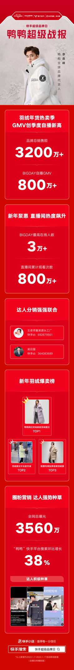 借助快手超级品牌日活动,鸭鸭在品牌与效果、站内与站外、流量与话题等方面同时发力,打造品牌营销大促,实现全域流量蓄水,创造品牌在快手生态的独立声量。