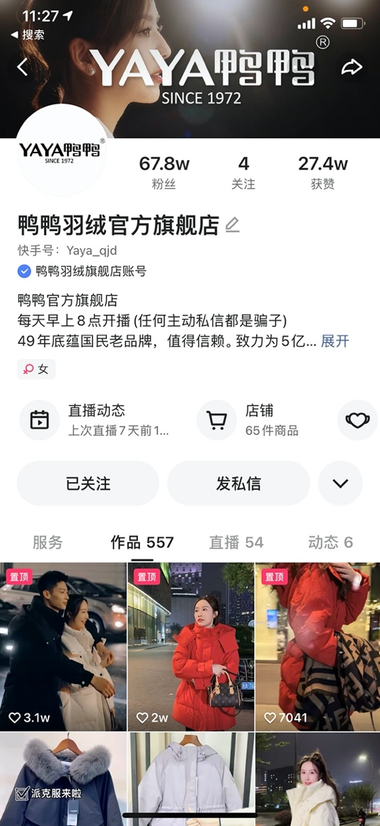 鸭鸭是中国知名羽绒服品牌,也是近三个月以来,在快手开展品牌自播成绩跃升最快的黑马品牌。自2021年9月鸭鸭入驻快手做品牌自播以来,不到两月便已实现单月GMV破亿。