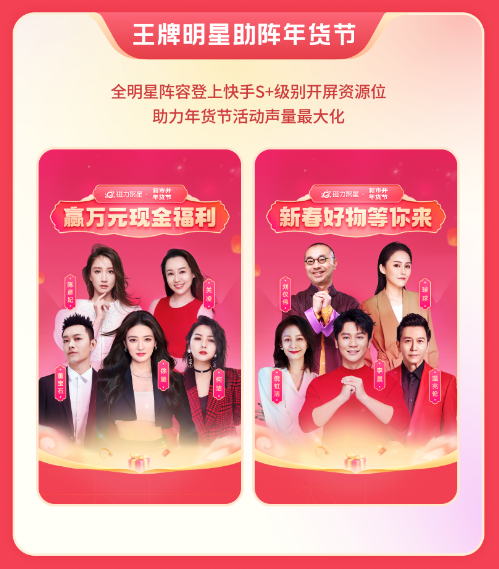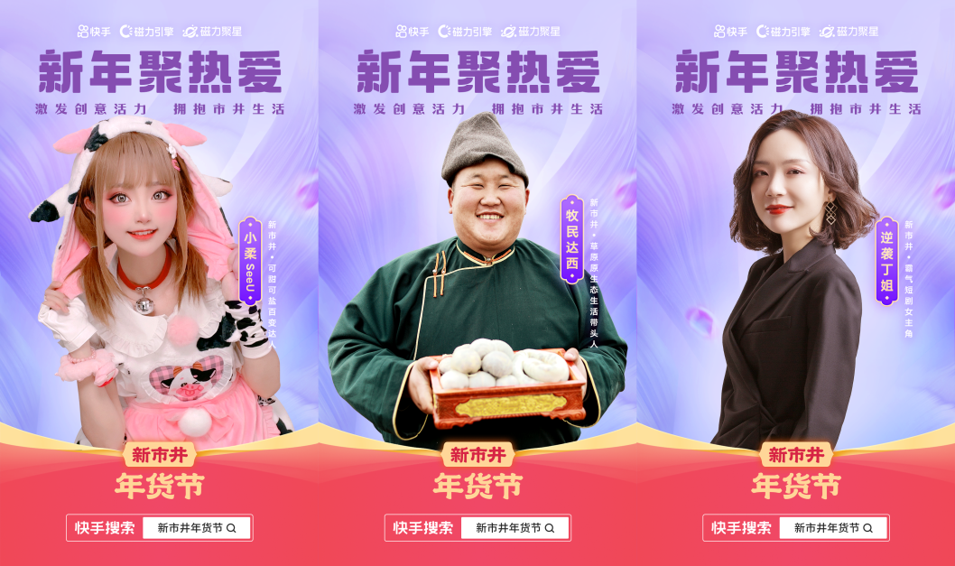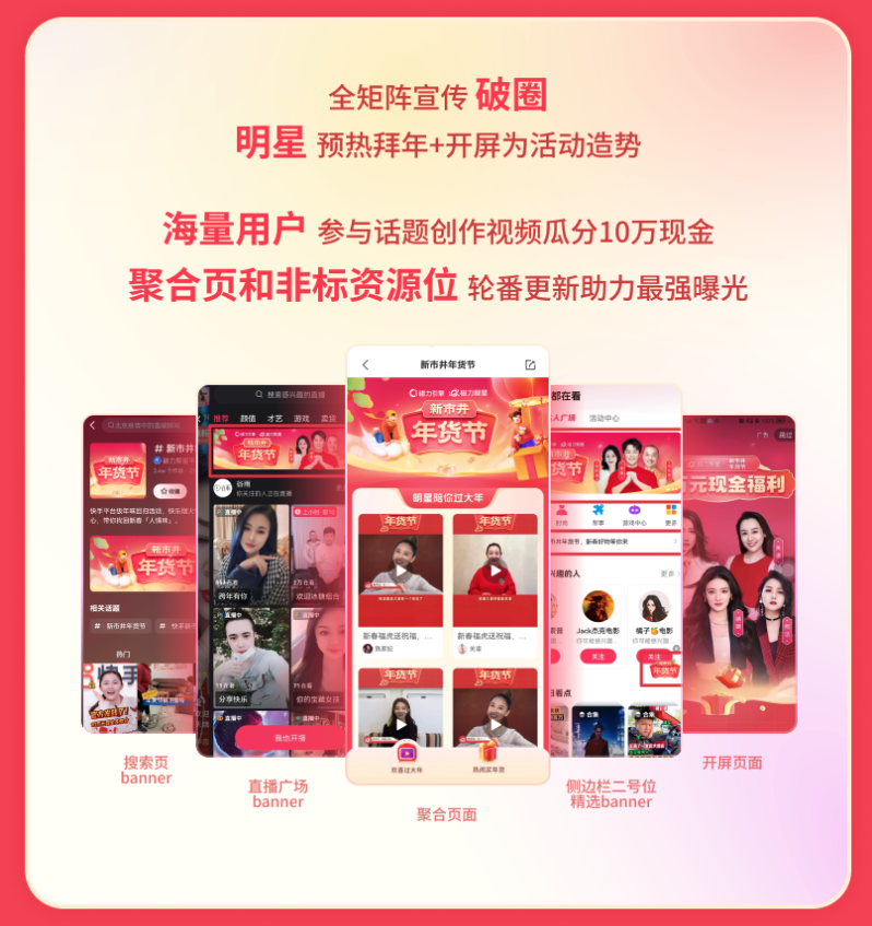 新市井年货节集结明星、头部达人阵容,通过品牌定制达人短视频+直播+挑战赛等多元创意玩法,配合开屏等快手站内黄金资源矩阵,全面覆盖品牌宣传+好物种草+电商带货三大营销场景,助力品牌营销声量最大化,实现品效销合一。