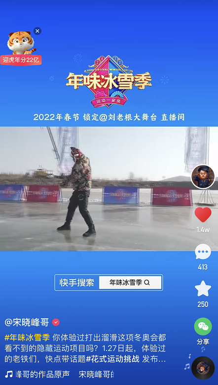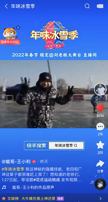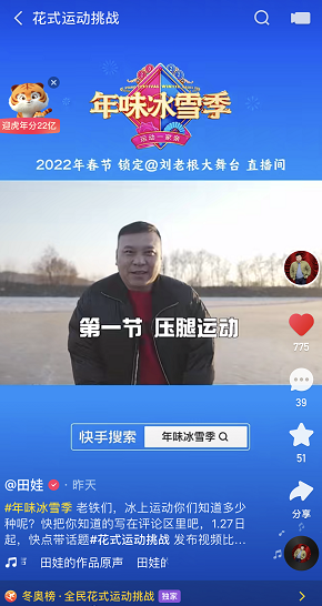 庆冬奥、迎新年,近日,快手联合刘老根大舞台打造冬季运动题材联欢活动——年味冰雪季,围绕“冬奥”、“冰雪”、“新年”为关键词,展开一系列的花式冰雪玩法。目前,快手已上线花式运动挑战、东北方言挑战等内容,宋晓峰、刘小光、杨树林、王小利等一众刘老根大舞台成员在相关话题页发布作品,展现不为人知的东北版冰雪技能。