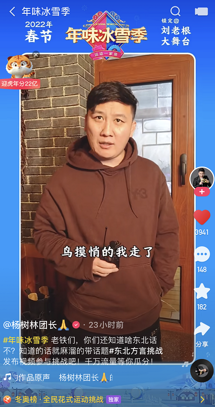 在快手年味冰雪季的系列活动中,东北方言挑战也引发了网友们的踊跃参与。不少人开玩笑称,东北话作为除普通话外的第二个全国通用语言早已深入人心,用心的刘老根大舞台成员也纷纷拿出了压箱底的方言展示。
