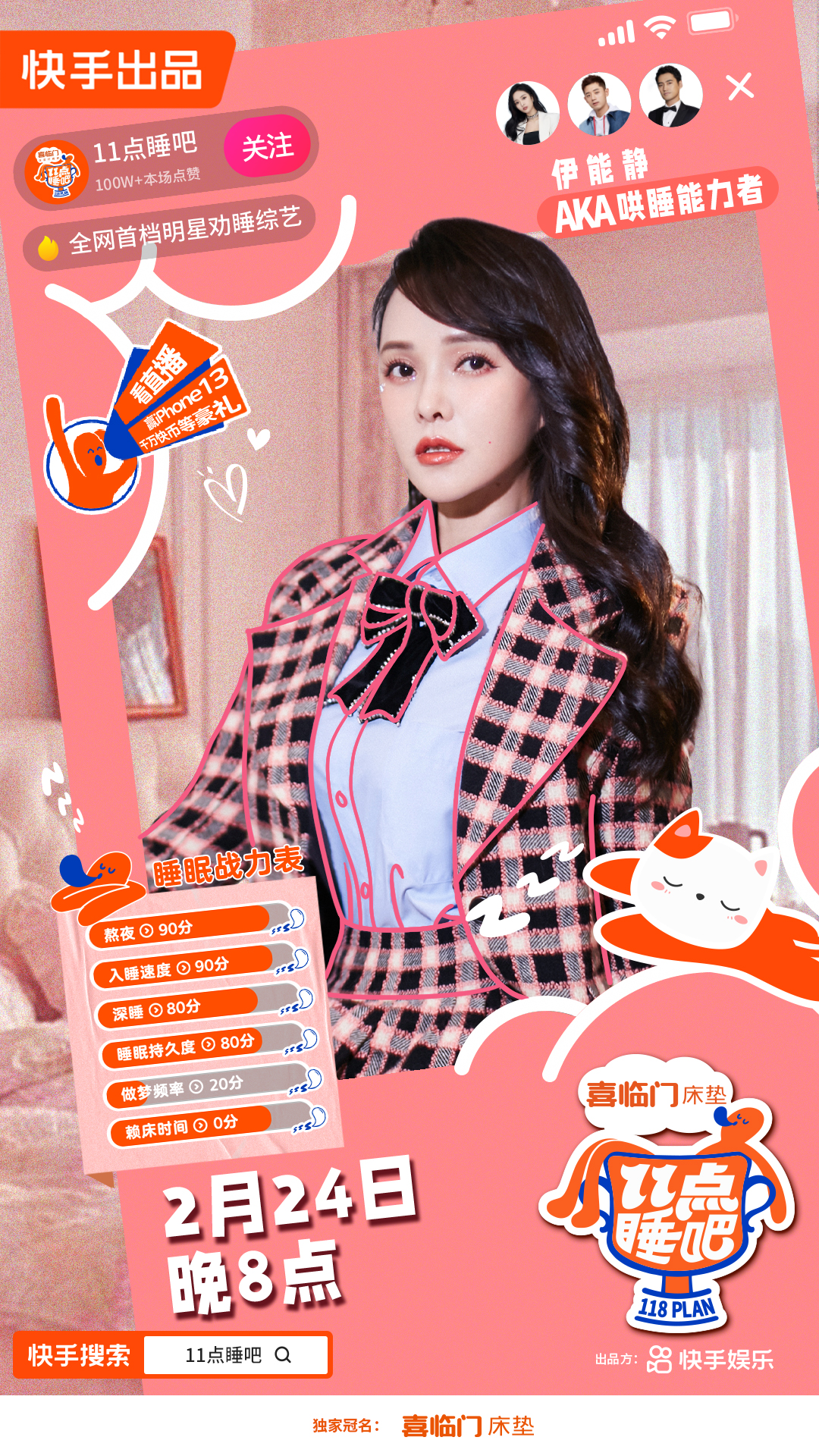 据悉,《11点睡吧》共7期,前6期为睡眠挑战赛,其中4期“睡眠挑战者”由明星艺人组成,2期由快手达人组成。明星达人们将“以身效法”,围绕不同核心主题,持续揭示睡眠健康的普遍问题。