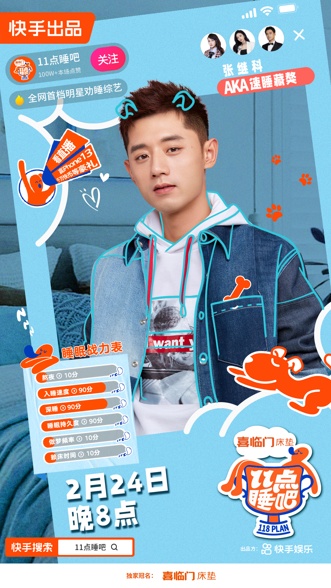 为早睡困难症开方,快手娱乐制作全网首档明星劝睡综艺《11点睡吧》,喊出“high什么high,早点睡”口号,聚焦睡眠健康,推出明星睡眠挑战。黄子韬将作为领睡人,邀请16位艺人嘉宾与8位快手达人组成“想睡挑战团”,角逐大睡神杯。