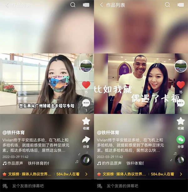 在机场和球星卡福偶遇后的合影、活动现场传奇球星米卢老爷子对中国球迷说的“加油”、 挂着梅西签名球衣的体育博物馆,还有星光熠熠的卡塔尔世界杯小组赛抽签现场......惟聪在快手全程记录下了整趟旅程中她的所见、所闻、所感。