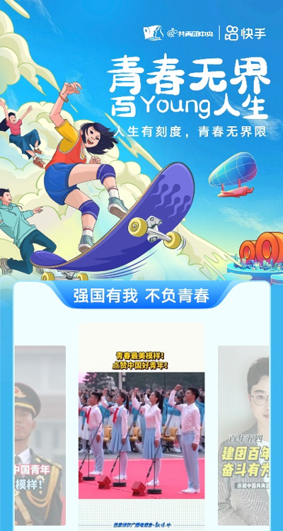 在中国共产主义青年团成立100周年之际,由共青团中央指导,快手发起的“青春无界,百Young人生”五四青年节主题活动,以不同海拔高度串联城市和乡村,集结各行各业中有代表性的青年奋斗故事,推出专题视频《青春十万米》,并上线 #快做好青年#、#百Young青春#话题征集活动、五四魔法表情短视频征集活动,联动快手站内的媒体号、政务号、正能量达人,唤起全民青春记忆,见证共青团成立百年的时代高光。