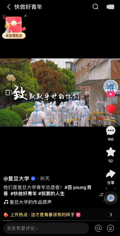 青年是标志时代的最灵敏的晴雨表。特殊时期,复旦大学的青年志愿者们化身“大白”和“小蓝”,戴上口罩,穿上防护服,放弃自己午休和吃饭的时间,为同学们送上三餐和物资。“复旦大学”快手账号分享本校志愿者日常点滴收获3.2万点赞,网友纷纷在评论区送上自己的加油和祝福。
