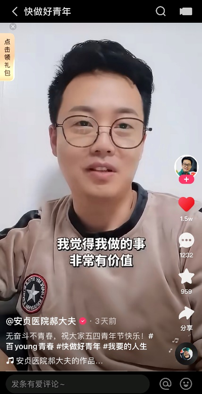 但行好事,莫问前程。青年的价值不仅在于实现自我,更在于奉献社会。青年节前夕,一直致力于医学知识科普的安贞医院郝大夫也向网友送出祝福,在他看来,即使短视频科普会占据自己的休息时间,但让老百姓足不出户在床头边学习健康知识,仍是一件非常有价值的事。