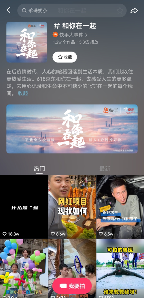 此前,快手打造首个新市井热点纪实系列内容IP,以“爱”为主题挖掘有温度的新市井内容。#和你在一起活动作为“爱计划”项目第一季,利用快手用户与内容优势,创新推出“纪实内容+直播事件+互动话题”整合内容模式,聚焦热门营销节点,进行多层次立体化内容包装,正向传递出京东传递与用户在一起的品牌形象,同时助力快手平台优质内容实现“破圈”传播。