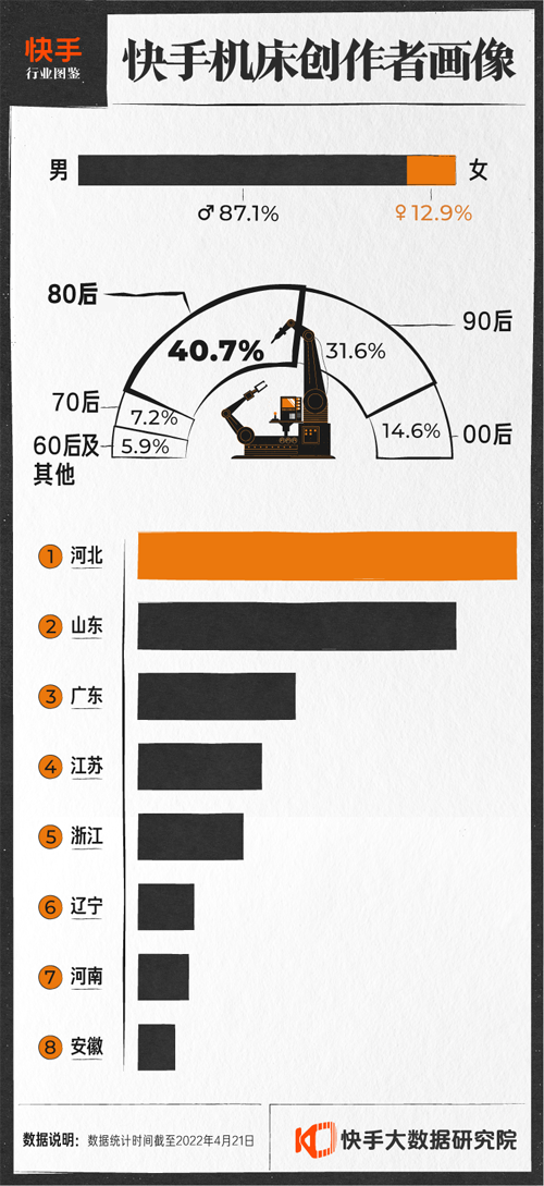 从快手机床行业相关用户看,他们不仅分布在沿海制造业重镇,也分布在河北、河南、安徽等内陆省份。不仅有学习能力旺盛的年轻人,也有从业多年的老师傅。