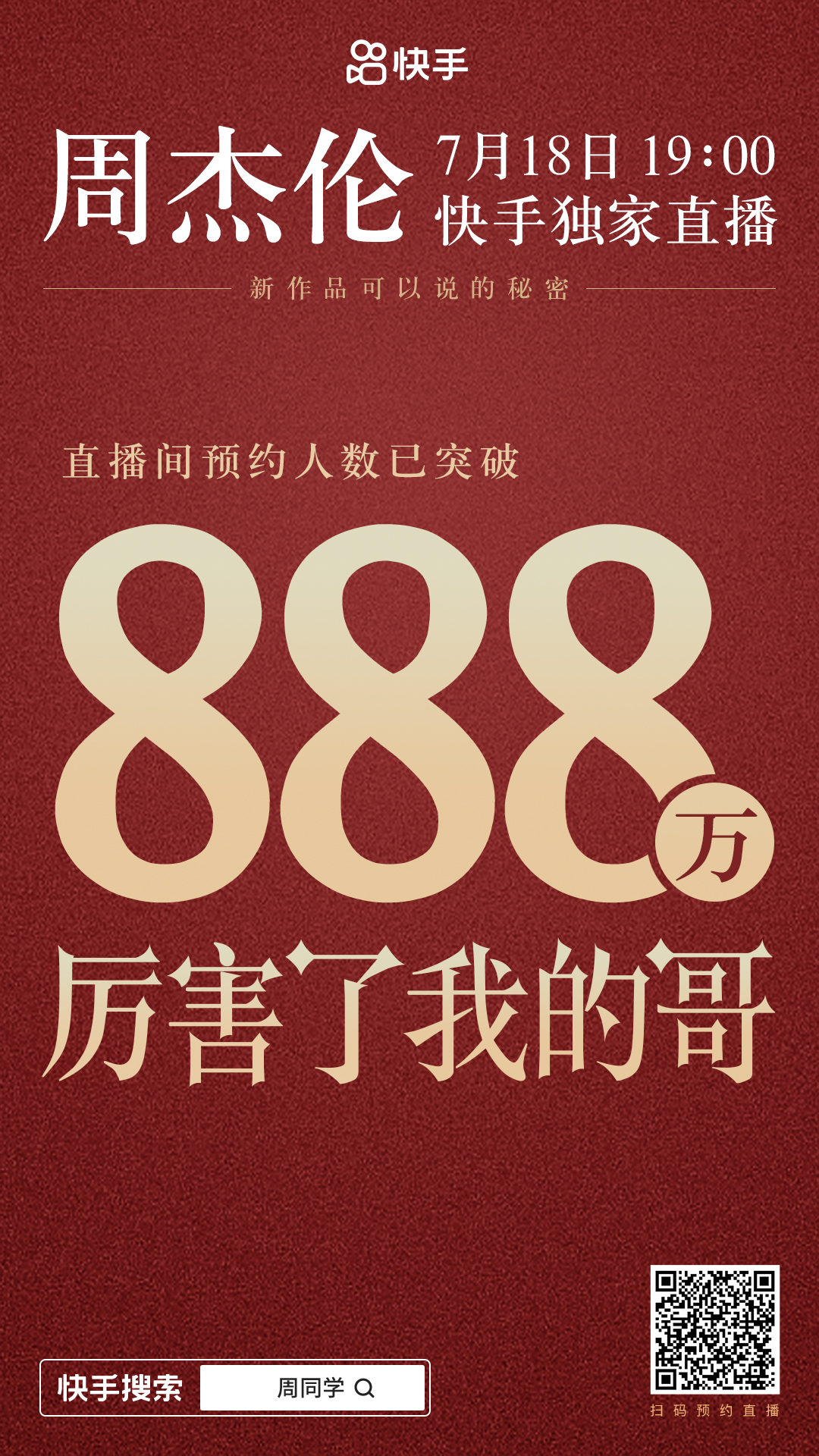 888万!距离7月18日19时周杰伦的快手独家直播还有1天,其直播预约人数已超888万,再次刷新快手站内单人直播预约人数的最高记录。随着周杰伦7月14日晚新专辑上线,短短一天时间,直播预约暴增500万人次,而周杰伦在快手站内独家发布的《粉色海洋》弹唱版视频更是在一天时间突破2亿播放量,点赞量高达500万。