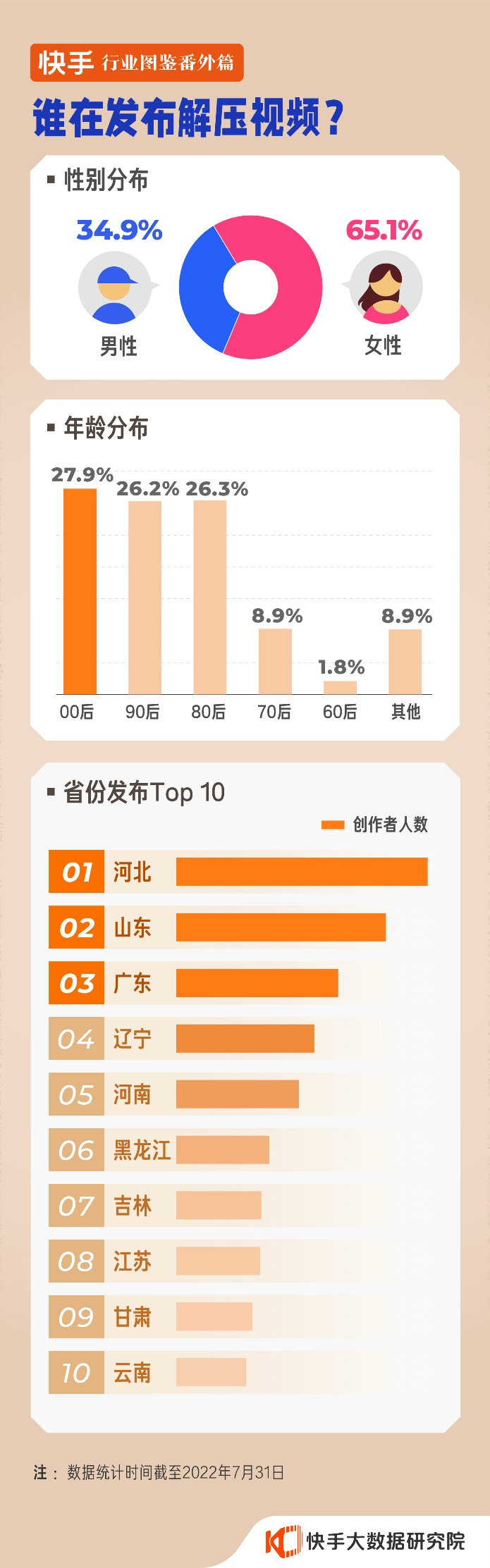 快手上的解压视频创作者以女性居多,占比超六成;80、90后创作者占比势均力敌,00后数量略高;河北、山东、广东是解压视频创作者最多的三个省份。