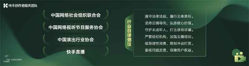 在此次快手联合三大协会发布的行业自律倡议中提到,要遵守法律法规,履行主体责任;严管经纪机构,加强主播培训;倡导理性消费,限制冲动打赏等,从行业主体、监管机构、主播个人层面提出了自律要求,不仅是从上到下的价值引领,更是能落实到每个参与者的工作指南。作为平台与主播之间的桥梁,公会可以说是快手直播生态里的重要力量,在促进行业规范发展中也扮演着重要角色。在行业自律倡议发布之时,快手直播还携手公会与主播提出了公会自律倡议与主播自律倡议,共同维护亿万网民的精神家园。