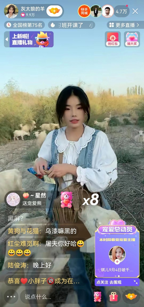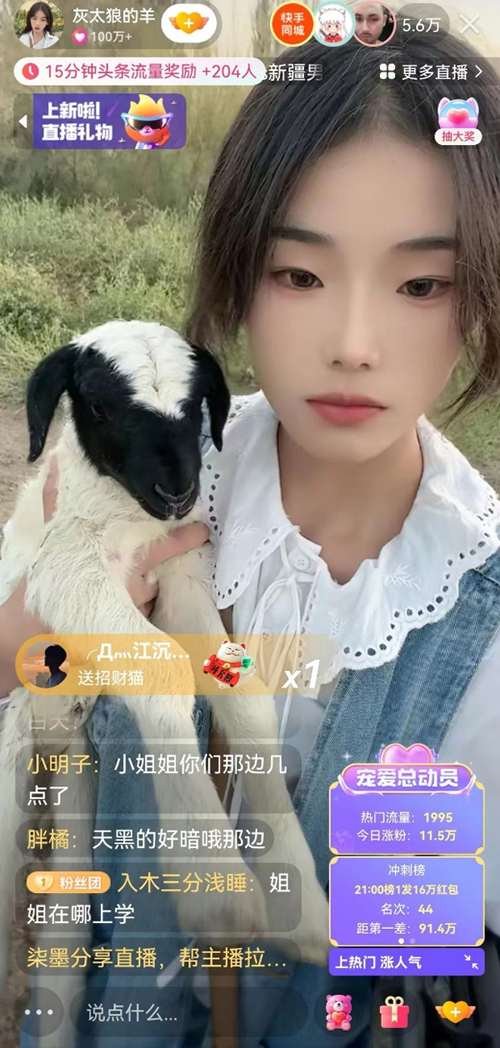 噶羊少女惠然的爆火,也彰显出快手上丰富多元的农村生活题材内容,正受到越来越多人的喜爱。同在新疆尉犁县的主播“疆域阿力木”,此前就凭借“你的背景太假了”走红全网。而在惠然本次快手首播中,她不仅带着观众们“云牧羊”,也在一片落日夕阳中让更多人看见了独特的新疆美景。整场直播观看人数近700万,登上了同时段新疆地区直播间热度榜第1名。