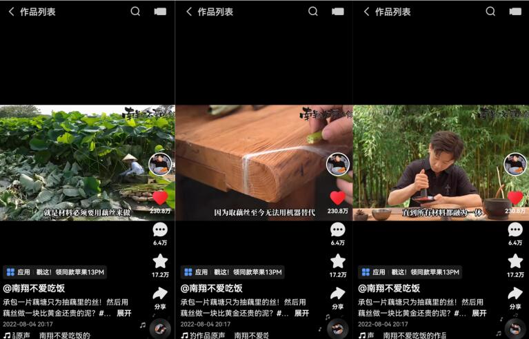 与此同时,他的匠心也延续到了美食领域之外。前段时间,“南翔”尝试还原了乾隆御用的龙泉印泥。“龙泉印泥不仅是有名的贡品,更是民族流传百年的文化传承,藕丝的加入可以让印泥存放百年都不腐败。”“南翔”顶着40多度高温采藕,耗费三天三夜抽丝,最终让更多人见识到了这份宝贵的非物质文化遗产,也获得了230万+点赞。