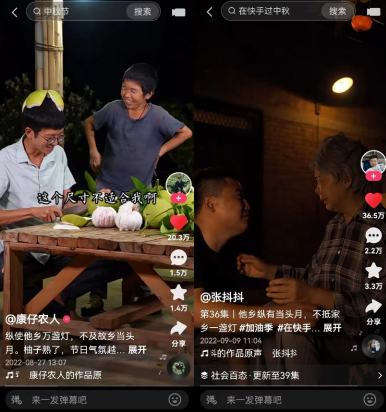 与此同时,平台上掀起了一股中秋主题创作热潮——生活、短剧、亲子、二次元、美食……超16个垂类中,优质作品不断涌现,差异化内容各具特色,成为快手老铁眼中的“中秋视觉盛宴”。三农达人“康仔农人”的中秋由柚子灯照亮,庭院中的星星点点打开了无数老铁记忆的闸门,童年的中秋节再次在脑海中浮现。在外奔波的儿子,盼子回家的母亲,借由一盘母亲亲手制作的月饼,短剧达人“张抖抖”演绎母子中秋团聚的情景,温暖动人。