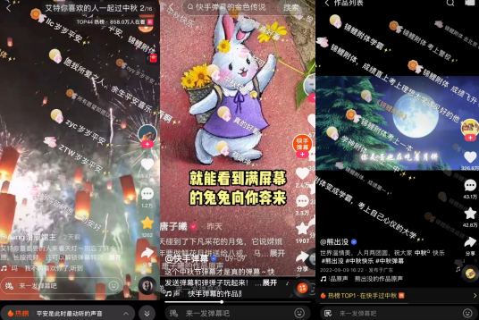 中秋期间,在快手点开节日主题短视频发布中秋祝福弹幕,屏幕上就会飘过一只只怀抱月饼、月亮的玉兔,快手弹幕推出的这一中秋限定月兔弹幕“萌化了”一众网友。在中国航天局官方账号“中国的航天”发布的嫦娥号探月视频中,十几万网友使用“玉兔版弹幕”留言,一条条飘过的弹幕好似被放飞的愿望,在此刻随着嫦娥号一同奔向月亮。