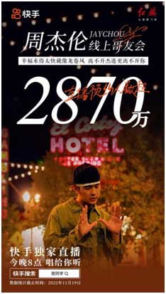 11月18日,持续飙升的预约人数突破2500万,直播前最后一个彩蛋「哥的心声」成功解锁,快手正式公布了「哥友会」的完整歌单,包括3首由粉丝票选得出的经典老歌《半岛铁盒》《晴天》《稻香》以及新专辑中首次全网演唱的2首新歌《还在流浪》《错过的烟火》。