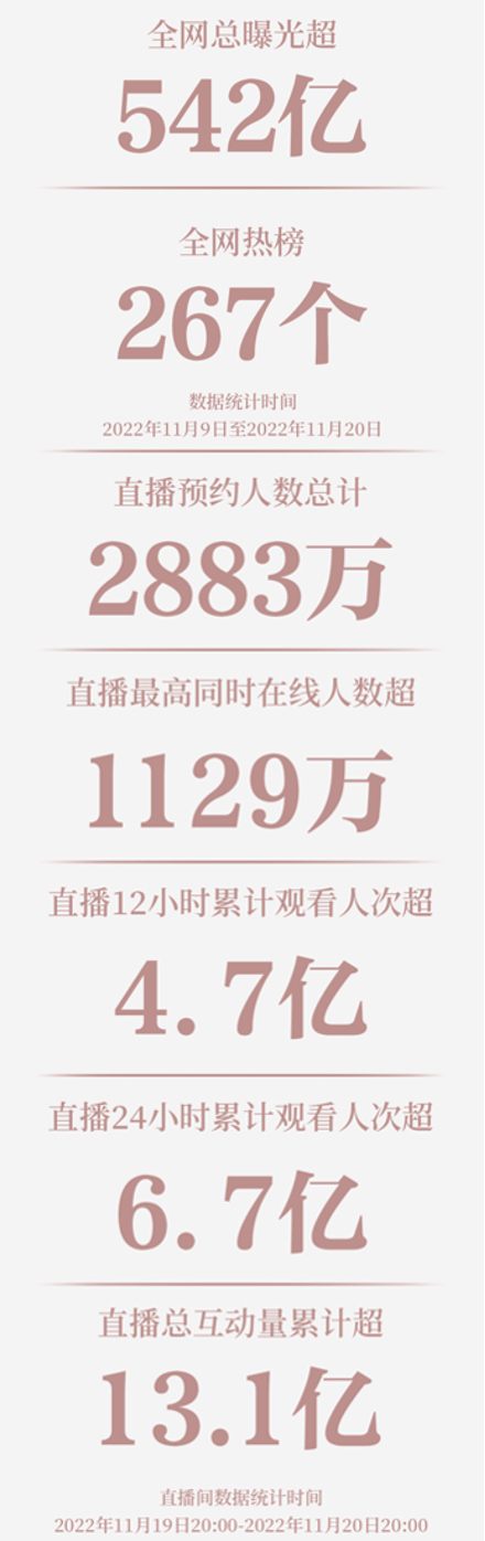 值得一提的是,周杰伦的人气更体现直播间的观看人数上,根据快手官方数据显示,直播最高同时在线人数超1129万,按照国家体育场“鸟巢”能容纳9.1万人计算,相当于在“鸟巢”同时举办了124个线下演唱会。为满足用户热情,快手官方在哥友会首播结束后开启纯享重播,依然热度不减。周同学直播间首播加重播的24小时累计观看人次超6.7亿,直播总互动量高达13.1亿。