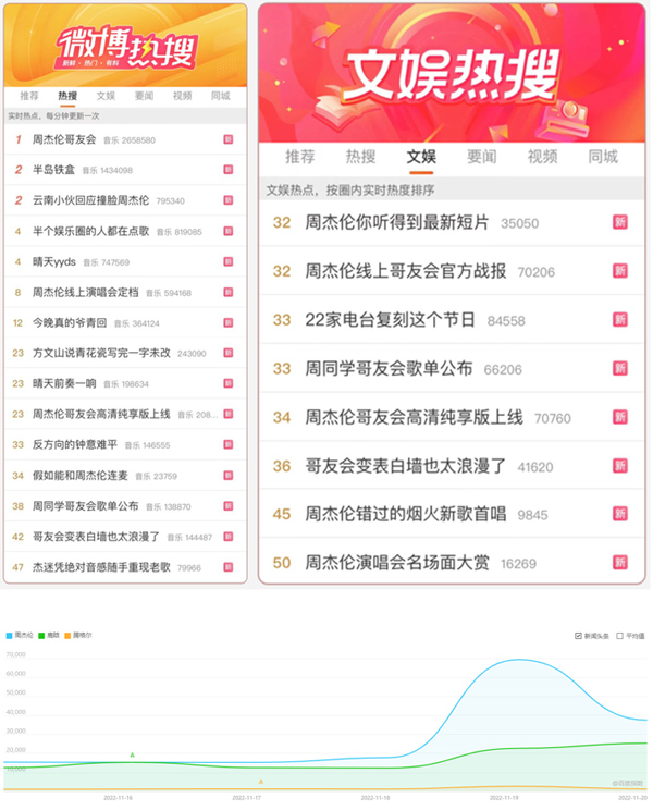作为国民级明星,周杰伦这场音乐狂欢不仅成功点燃了快手用户的热情,也蔓延至快手之外的其他平台,“哥友会”期间,相关话题不但登顶头条和知乎等热榜,更是在微博等社交平台持续刷屏。统计数据显示,周杰伦“哥友会”全网热榜达267个,全网总曝光超542亿,另外根据百度指数显示,周杰伦在当天新闻资讯将近70000条,热度大大超过同天线上演唱会的鹿晗和其他艺人,周杰伦用实力证明谁是“真·顶流”。