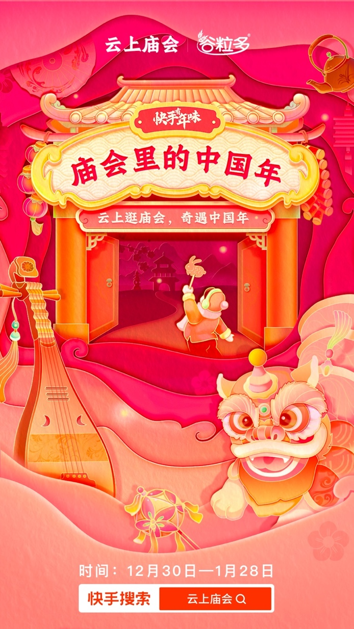 在除夕前,持续一个月的快手云上逛庙会活动将陪你慢慢感受年的味道,快手与伊利谷粒多携手,上线5大内容街区,邀老铁一起看民俗巡演舞动新春,听妙趣书场巧谈年景,赏云上乐宴丝竹之音,逛手艺市集迎接兔年,看区域春晚欢庆新年,一站式打造好逛、好看、好听、好玩的新春盛宴。